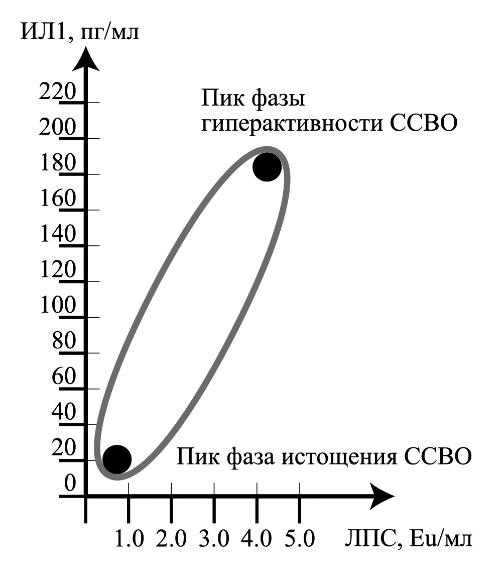 Рис. 4. Периодичность синдрома системного воспалительного ответа (ССВО) при ВИЧ-инфекции, когда фаза ЛПС-индуцированной гиперактивации иммунной системы сменяется ее истощением, связана с циклами репликации вируса и обусловленной ими повреждением кишечного барьера (по [19] в авторской модификации).