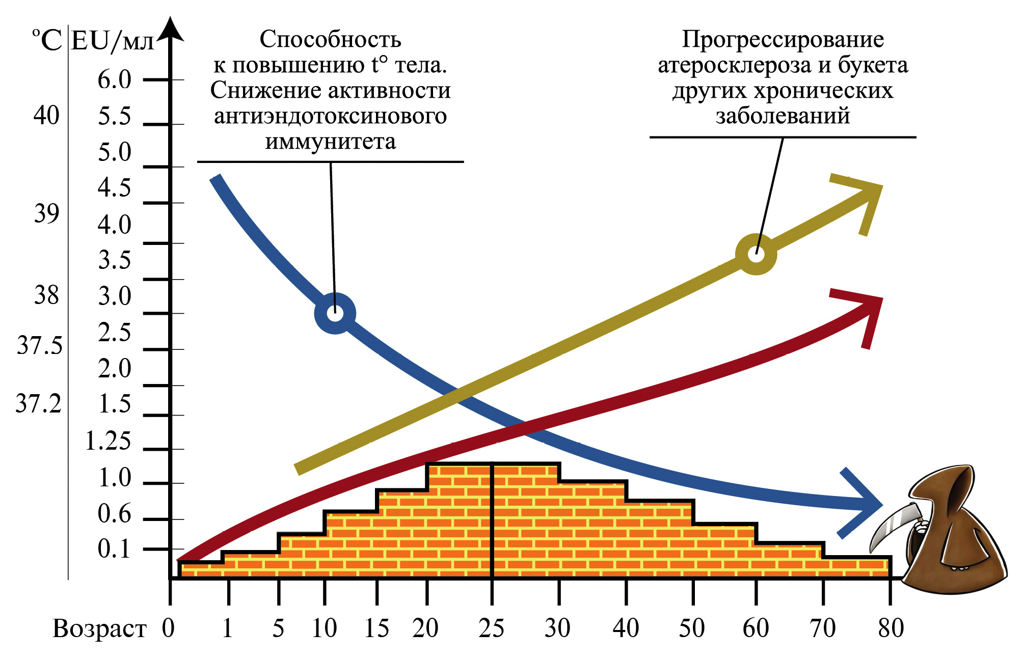 Рис. 5. Возрастные изменения интегральных показателей системной эндотоксинемии характеризуются увеличением уровня ЛПС в крови, снижением интегральных показателей активности гуморального звена антиэндотоксинового иммунитета и способности организма к повышению температуры тела (по [7] в авторской модификации).