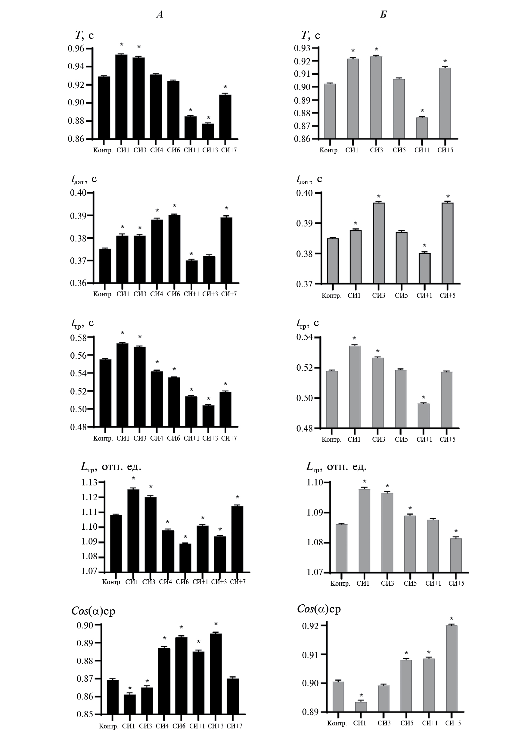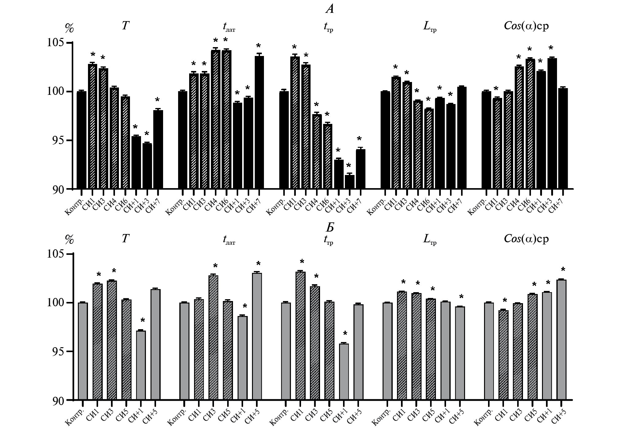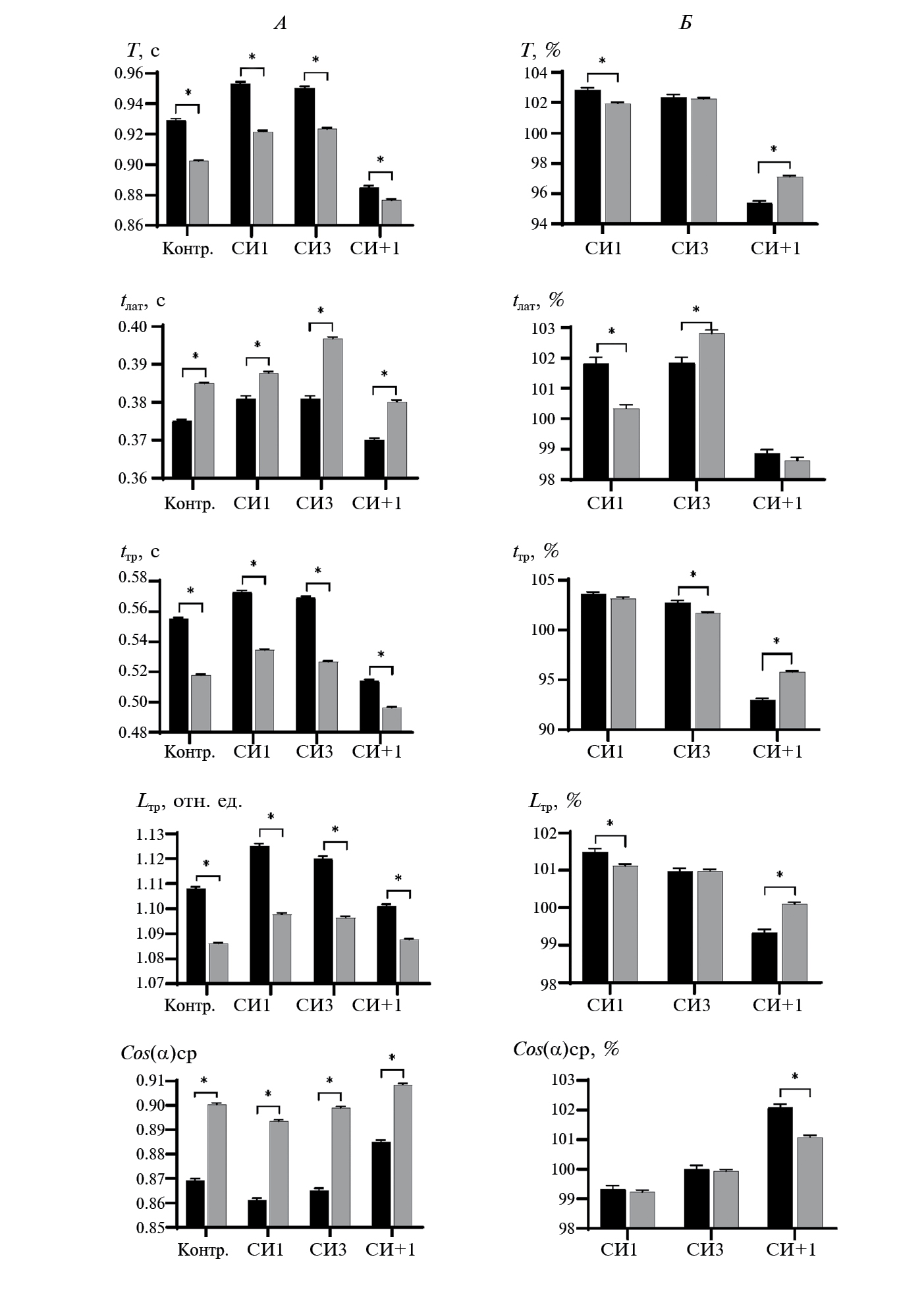 Рис. 2. Динамика индивидуально пронормированных к контрольным значениям, и затем усредненных (M ± se) по группе и по всем мишеням за сеанс тестирования параметров траекторий движения курсора. А — у мужчин (черные столбики); Б — у женщин (серые столбики). Для удобства восприятия данные, относящиеся к СИ, выделены штриховкой. Звездочки – достоверные отличия от контрольных значений (p < 0.01).