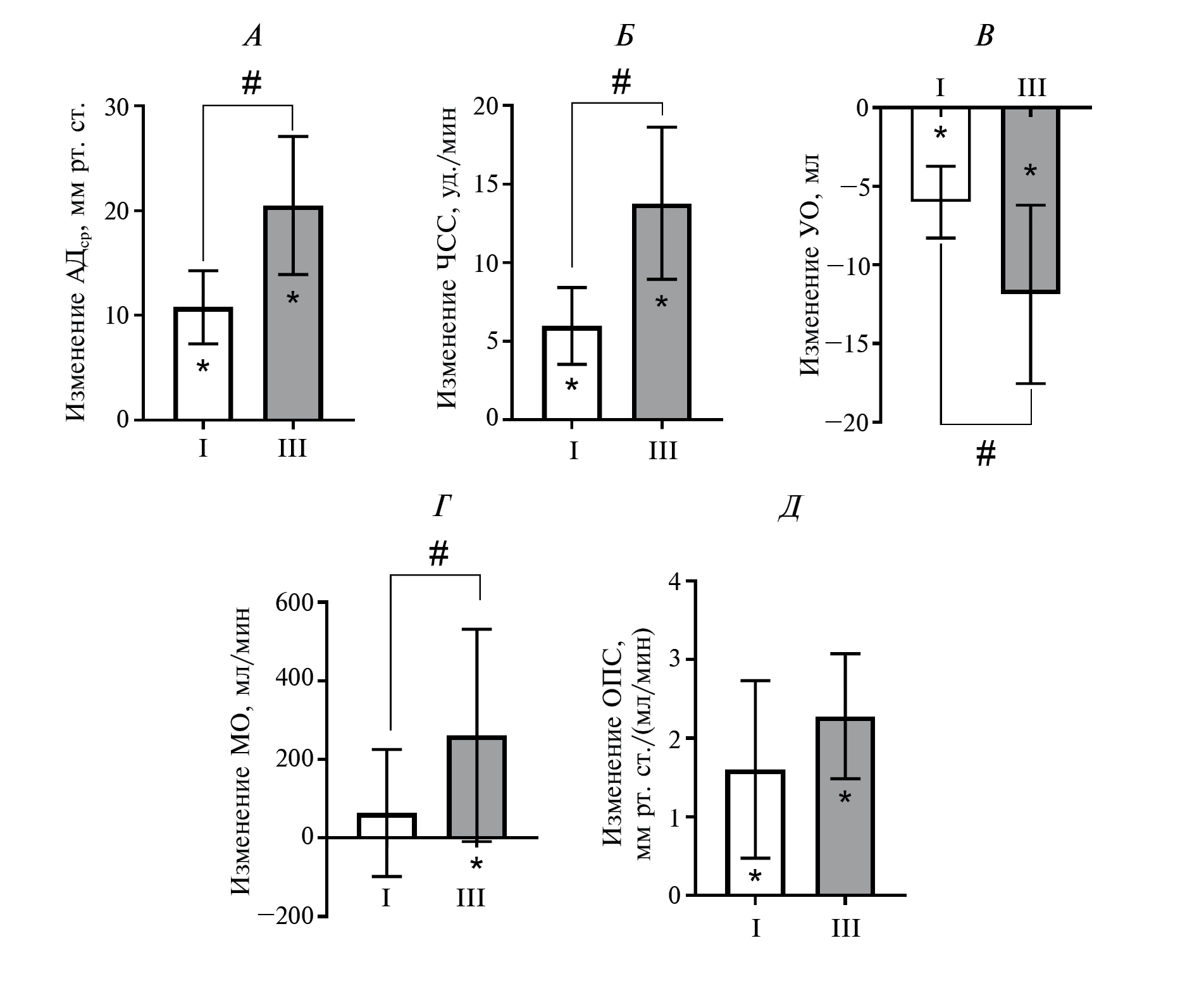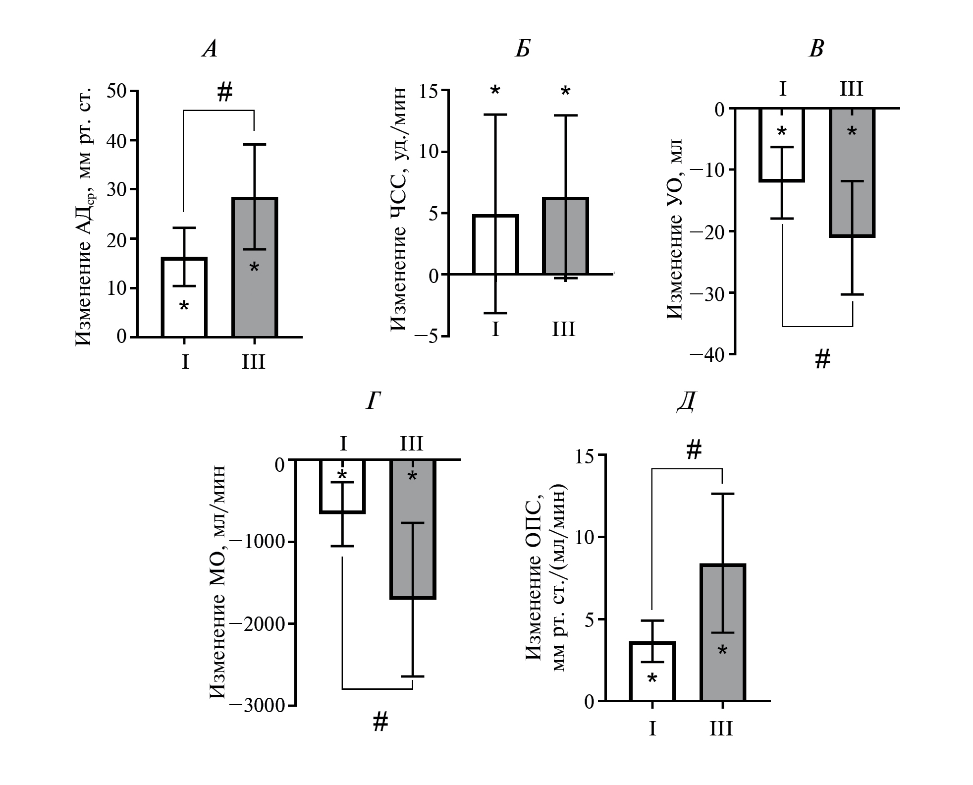 Рис. 3. Изменения среднего артериального давления (АДср, А), частоты сердечных сокращений (ЧСС, Б), ударного объема (УО, В), минутного объема сердца (МО, Г) и общего периферического сопротивления (ОПС, Д) при при статических сокращениях мышц-сгибателей руки в лучезапястном суставе в I трети и III трети теста (нулевой уровень – значение во время расслабления мышц). Данные представлены в виде среднего и стандартного отклонения; n = 9. * – p < 0.05 – одновыборочный t-тест Стьюдента; # – p < 0.05 – парный t-тест Стьюдента.