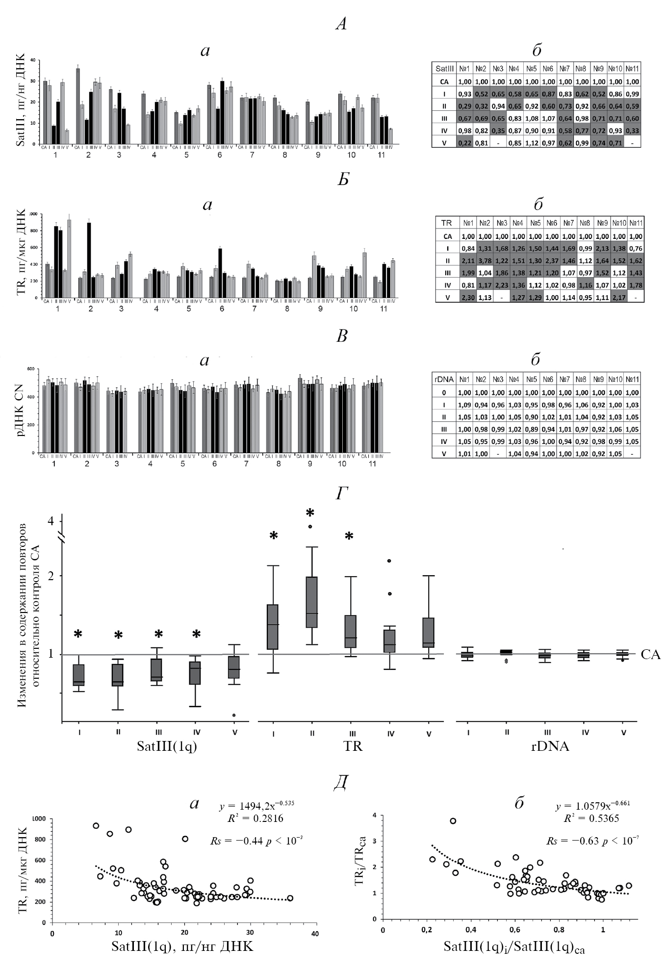 Рис. 2. Изменения содержания трех тандемных повторов в ДНК, выделенной из клеток крови зимовщиков. А – содержание повтора SatIII(1q) в образцах ДНК, выделенных из клеток крови каждого зимовщика (а), и анализ изменений содержания SatIII(1q) у зимовщиков в условиях работы на станции по сравнению с периодом до прибытия на станцию (б); Б – содержание повтора TR в образцах ДНК, выделенных из клеток крови каждого зимовщика (а), и анализ изменений содержания повтора TR в условиях работы на станции по сравнению с периодом до прибытия на станцию (б); В – содержание рДНК в образцах ДНК, выделенных из клеток крови каждого зимовщика (а), и анализ изменений содержания рДНК в условиях работы на станции по сравнению с периодом до прибытия на станцию (б); Г – изменения в содержании повторов в клетках, полученных от зимовщиков в точках I–V, по сравнению с контролем (СА). Точки I–IV: N = 11 образцов ДНК; V: N = 9. * – содержание повторов в группе I–V отличается от содержания в контрольной группе (p < 0.01). Д – зависимость содержания (а) и изменения содержания (б) TR в ДНК от содержания и изменения содержания повтора SatIII(1q). Приводятся данные корреляционного анализа Спирмена (Rs и p). На рисунках А–В приводится среднее значение для трех измерений и ошибка измерения (SE). Темно-серый цвет столбиков – пробы крови получены до прибытия на станцию (проба СА). Серый цвет – пробы, полученные в период полярного дня. Черный цвет – пробы, полученные в период полярной ночи. На рисунках А–В белый цвет в таблицах – значение параметра не изменилось (p > 0.05, U-test); серый – значение параметра отличается от контроля (p < 0.05).
