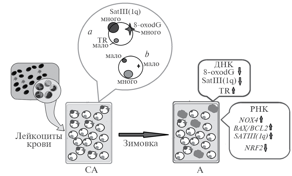 Совокупность фактов позволяет предположить, что условия зимовки в Антарктиде стимулируют усиленную гибель особой фракции клеток крови, которые в обычных условиях, в отсутствие стресса, накапливаются в крови и элиминируются достаточно медленно (рис. 5). ДНК этих клеток повышенно окислена, содержит много SatIII(1q) и мало TR (рис. 5). Популяция белых клеток крови гетерогенна. Содержание SatIII(1q) потенциально может снижаться в одних клетках, например в лимфоцитах, а содержание TR повышаться в других клетках, например в нейтрофилах. Однако наши предыдущие исследования на клетках одного типа (культивируемые линии стволовых клеток и фибробластов кожи и выделенные лимфоциты человека) позволяют предположить, что перечисленные изменения происходят в одних и тех же клетках. В дальнейшем мы планируем исследовать отдельно различные типы белых клеток крови на предмет варьирования содержания SatIII(1q) и TR в нормальных условиях и в условиях стресса.