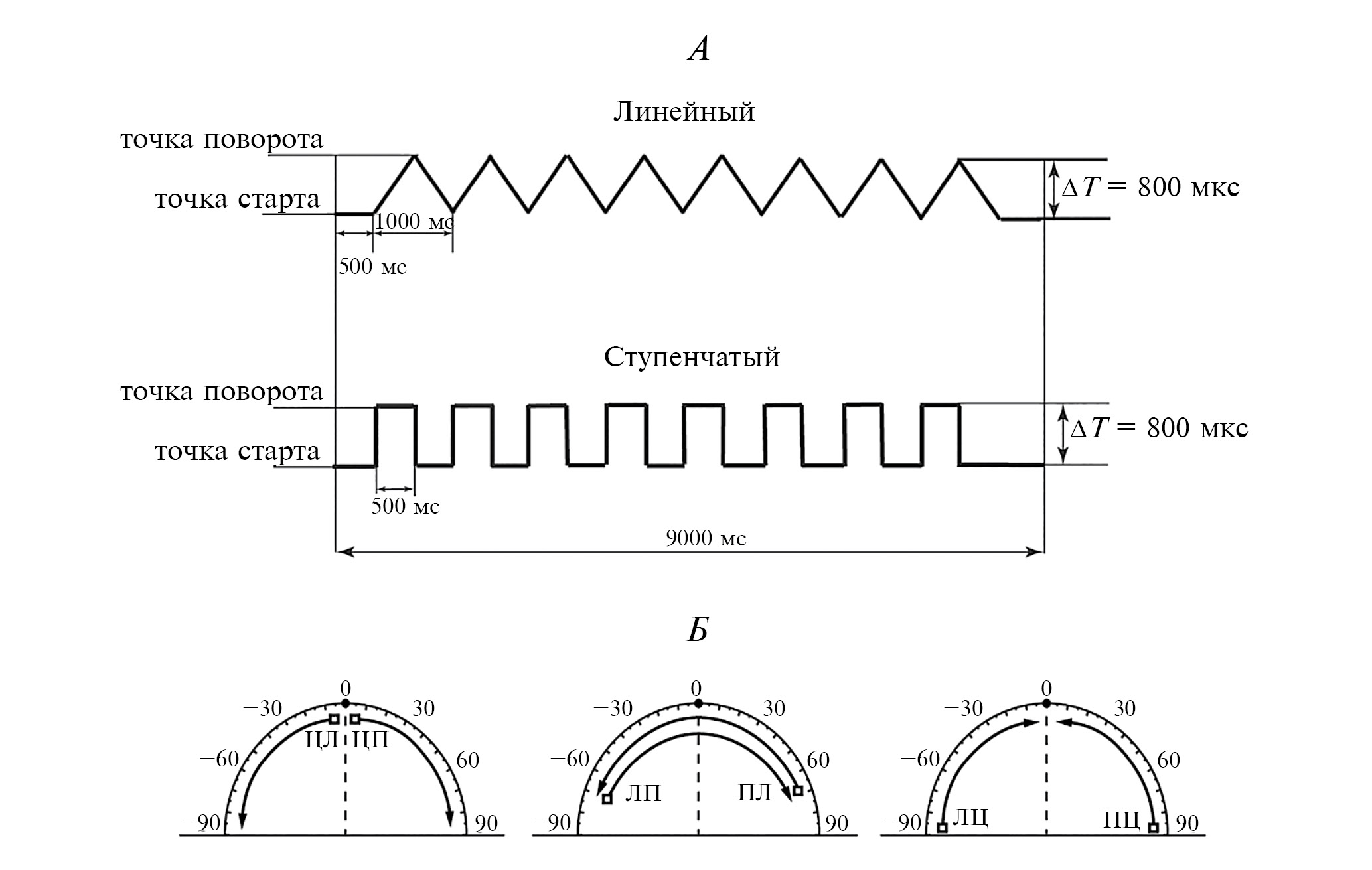 Рис. 1. Схема изменения межушной задержки ΔТ и расчетные положения траекторий движения бинауральных звуковых стимулов. А – по горизонтали – время (мс), по вертикали – величина межушной задержки (ΔТ, мкс). Б – разные положения траекторий циклического движения в субъективном слуховом пространстве