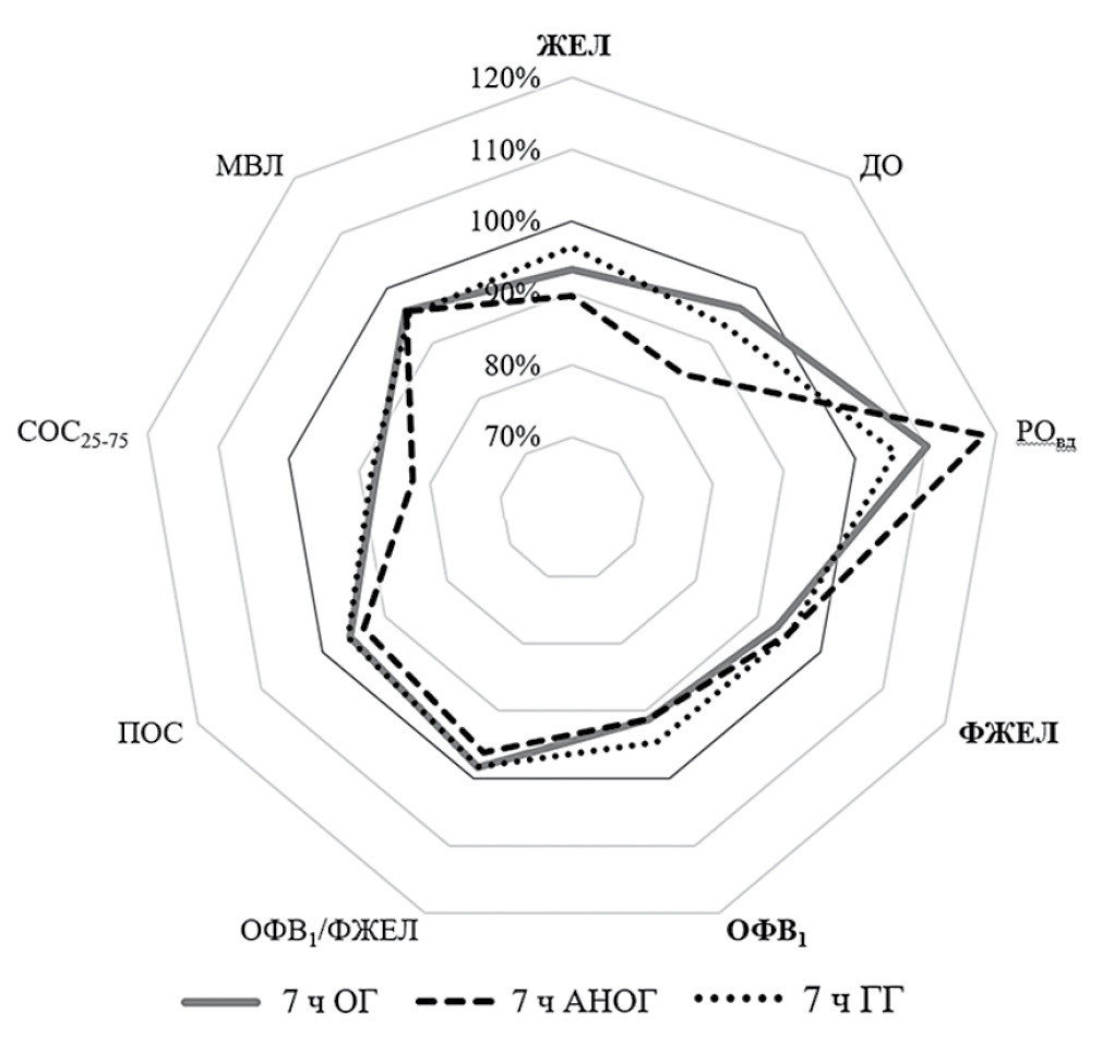 Таким образом, в острый период воздействия различных экспериментальных моделей (ОГ, АНОГ и ГГ) наблюдаются однонаправленные изменения параметров внешнего дыхания испытуемых (рис. 1). Несмотря на то, что в условиях АНОГ динамика некоторых показателей (ЖЕЛ, ОФВ1) имела тенденцию (p ≤ 0.1) к более выраженным изменениям относительно фоновых значений, значимой разницы между тремя условиями экспериментального воздействия не было обнаружено (p ˃ 0.05).
