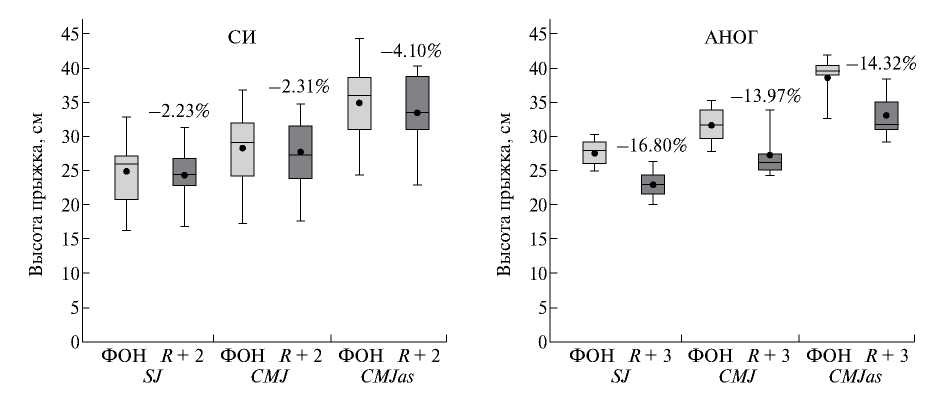 Группы СИ и АНОГ значимо отличались между собой в период фоновых исследований по показателю максимальной высоты прыжка. Значимые различия были обнаружены при сравнении результатов в прыжках типа CMJ и CMJas.
