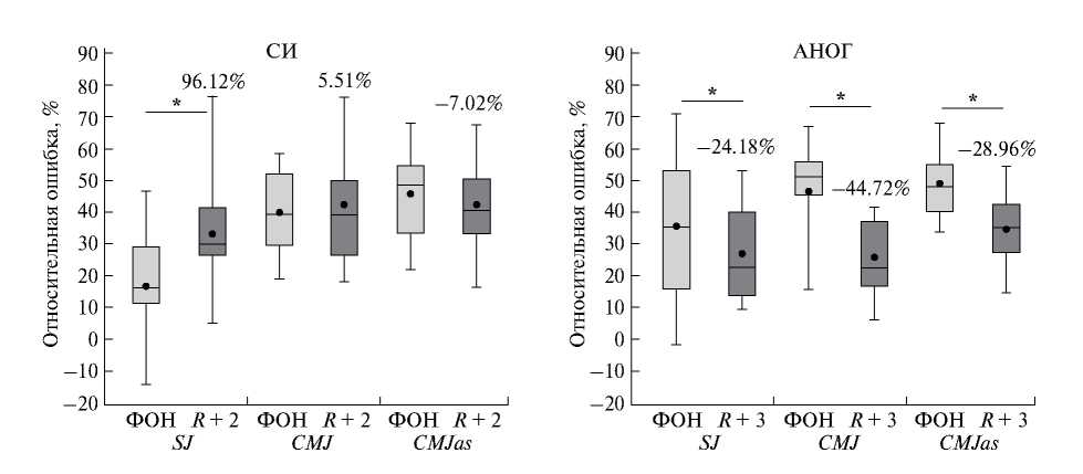 Значения относительной ошибки при проведении фоновых исследований были идентичны в обеих группах испытуемых (АНОГ и СИ) во всех типах прыжков, кроме SJ (p < 0.05). В период последействия величина ошибки значимо отличалась между группами АНОГ и СИ в прыжках типа CMJ (p < 0.05).