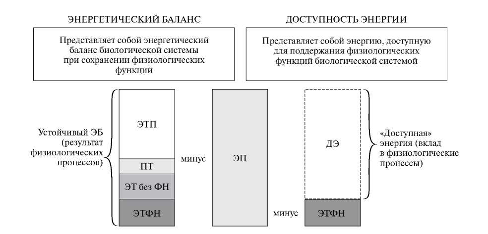 Рис. 5. Различия в концепциях энергетического баланса и доступности энергии. ЭТП – энерготраты покоя; ПТ – пищевой термогенез; ЭТ без ФН – энерготраты без физической нагрузки; ЭТФН – энерготраты при физической нагрузке; ЭП – энергопотребление; ДЭ – доступность энергии; ЭБ – энергетический баланс.