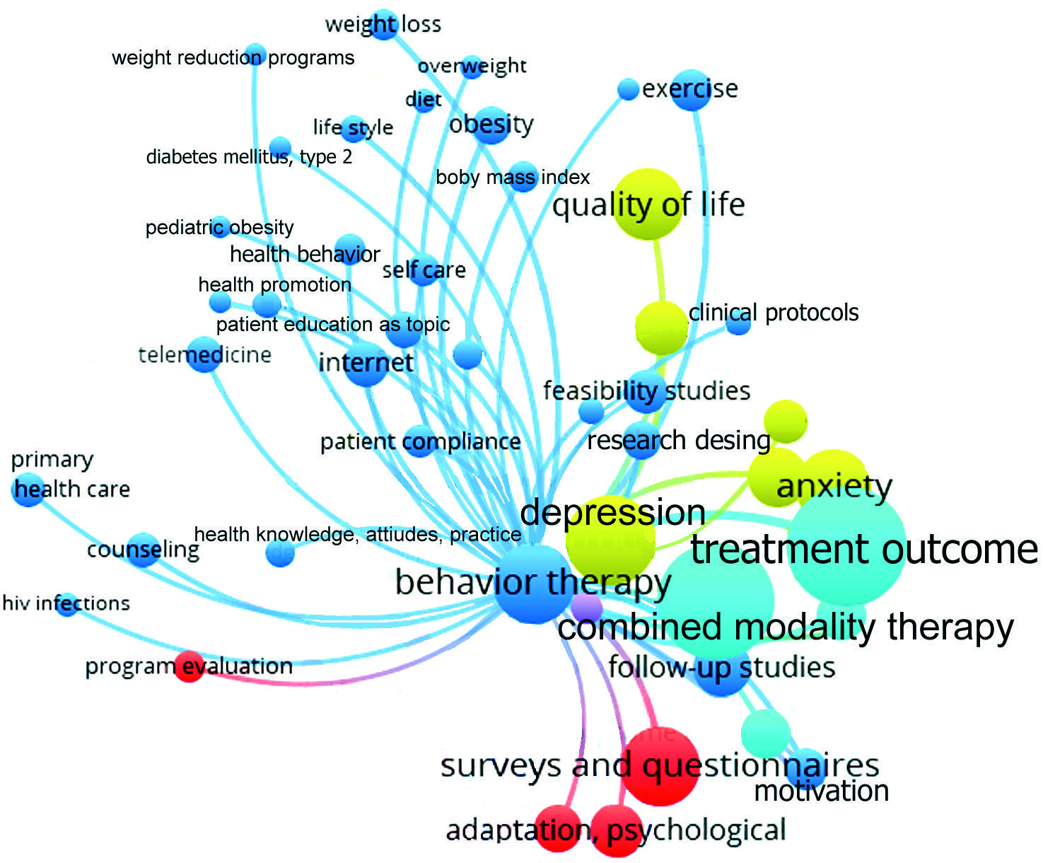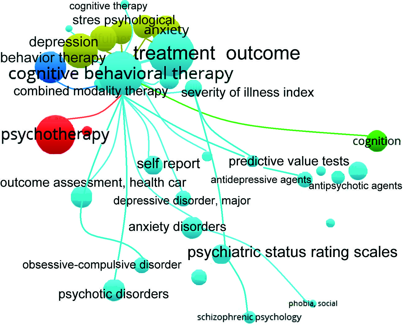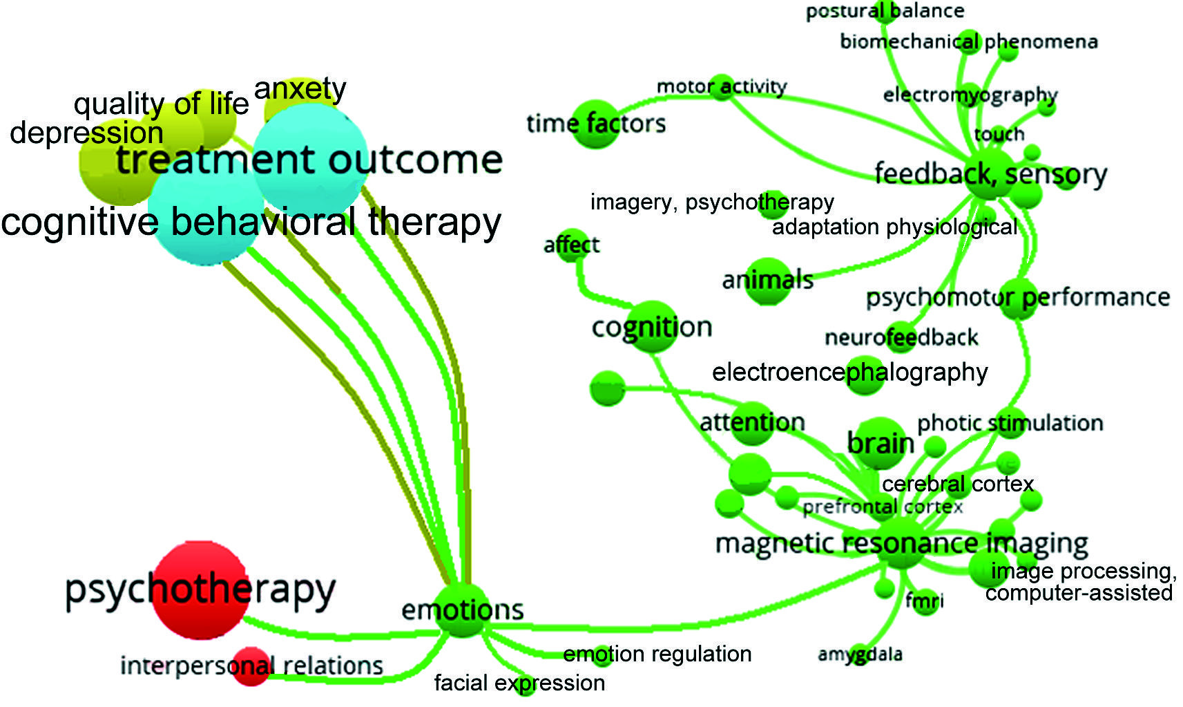 Заключение. При большом массиве публикаций программа VOSviewer позволяет выявить основные направления научных исследований в изучаемой отрасли знаний и определить приоритеты будущих исследований в сфере психотерапии.