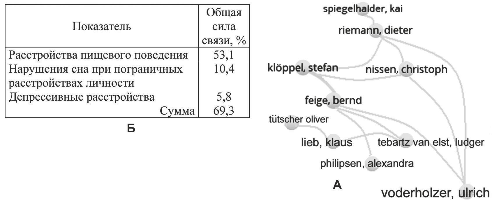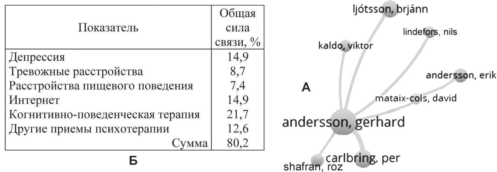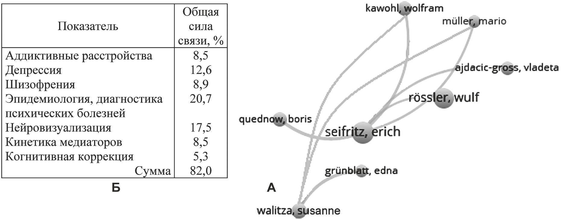 Рис. 20. Основные плеяды авторов (А) и общая сила связи ключевых слов (Б) в статьях 10-го кластера соавторства.