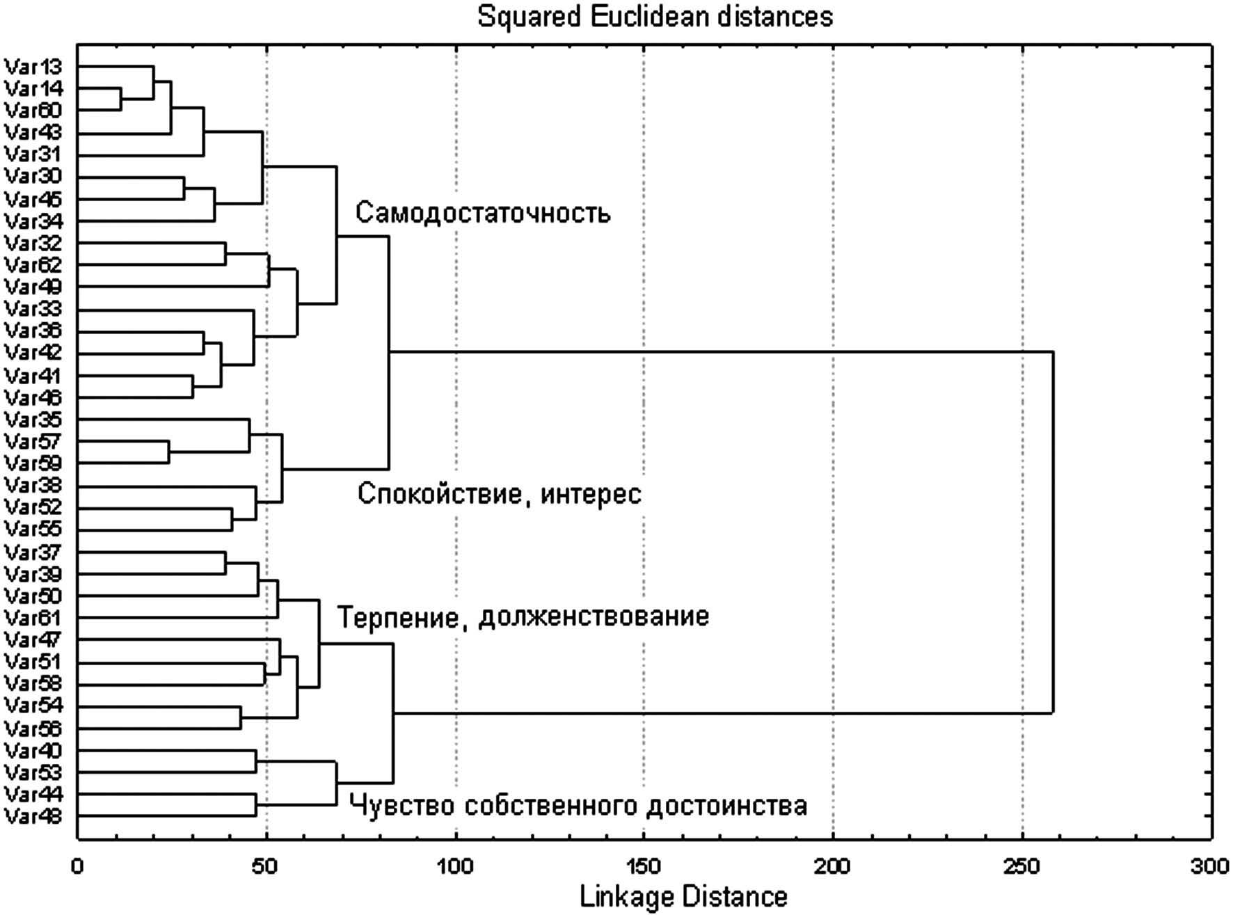 По результатам кластерного анализа после коррекции выделены 4 кластера: 1) самодостаточность; 2) спокойствие, интерес; 3) терпение, долженствование; 4) чувство собственного достоинства (рис. 2). Результаты кластерного анализа свидетельствуют о перемещении акцента самооценки с позиции социальной фрустрированности больных до тренинга на позицию эгоцентрированности, целостного самовосприятия и самодостаточности, осознания ценности здоровья (заботы о самом себе) и перестройки иерархии ценностей жизни после тренинга.