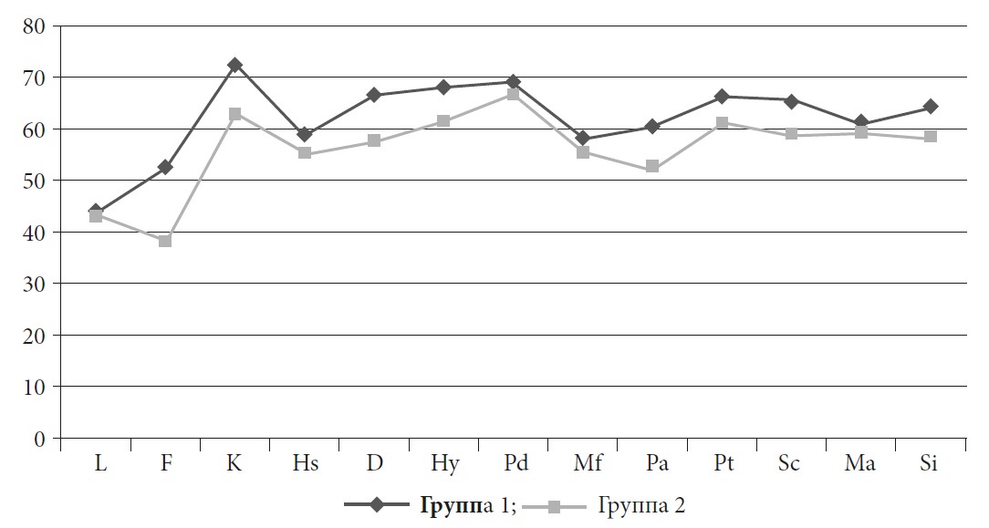 В результате сравнительного анализа показателей по методике МЛО «Адаптивность» были получены значимые различия, подтверждающие личностный профиль респондентов 1-й группы. Установлено, что для них характерен низкий уровень поведенческой регуляции на уровне тенденции (при p < 0,1), также они отличаются более выраженными признаками нервно-психической неустойчивости. Это находит свое выражение в достоверно более отчетливых проявлениях астено-депрессивных и психастенических реакций (D и Pt при p < 0,05), склонности к обидчивости и излишней фиксации на внешних и внутренних раздражителях (Pa при p < 0,05). Кроме того, у респондентов 1-й группы отмечено наличие склонности к импульсивным и аффективным реакциям (Pd при p < 0,05).