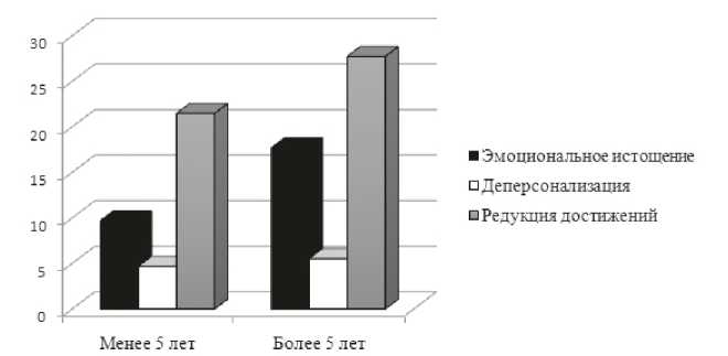 У участников исследования со стажем службы 5 и более лет (группа 2) статистически значимо (р ≤ 0,01) более выражено эмоциональное истощение, которое может проявляться в повышении психической истощаемости и выраженной аффективной лабильности, утрате интереса к коммуникации и неудовлетворенности собой и жизнью. Уровни деперсонализации и редукции достижений не продемонстрировали статистически значимых различий.