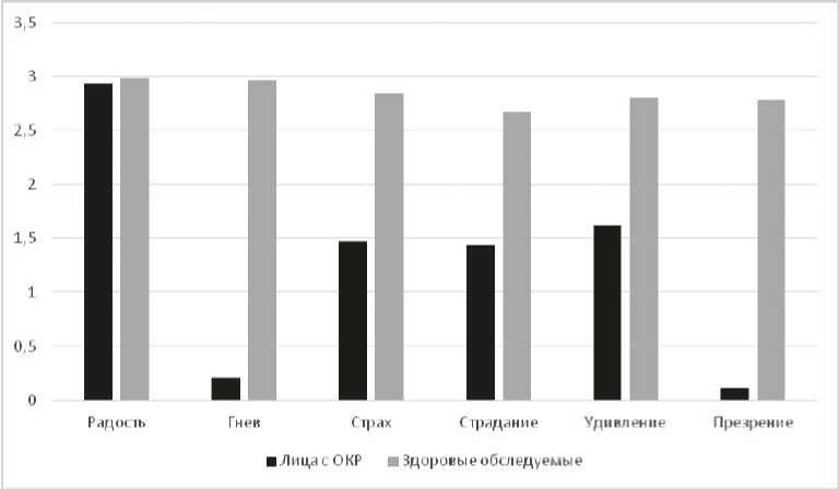 Проявляется значительный дефицит способности идентифицировать различные вариации презрения (0,11 ± 0,02) и состояния гнева (0,21 ± 0,03). Происходит смешение эмоций страдания (1,44 ± 0,04), страха (1,47 ± 0,07) и удивления (1,62 ± 0,03). С высокой точностью больные определяют исключительно радость (2,94 ± 0,09). Здоровые обследуемые легко расшифровывают мимические коды.