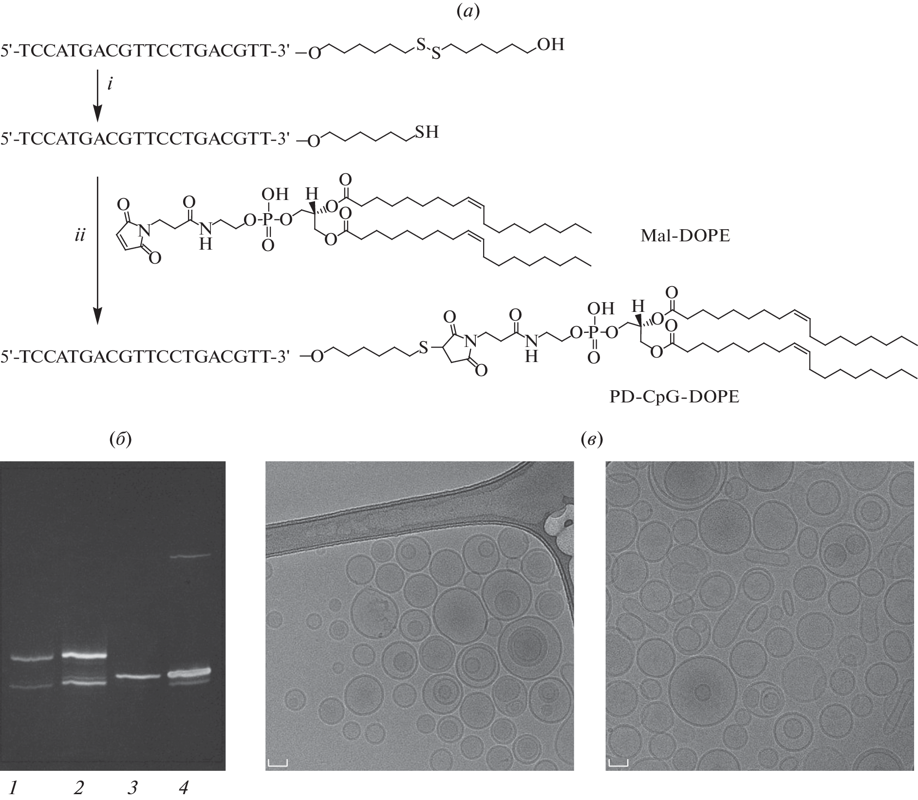The synthesis of lipid conjugate of immunostimulatory oligodeoxyribonucleotide CpG-ODN (PD-CpG-DOPE) is described. Liposomes loaded with a composition of T-cell epitopes of the SARS-CoV-2 virus (7 peptides) and carrying PD-CpG-DOPE conjugate in the membrane, including lyophilized liposomes suitable for long-term storage, were prepared. In vitro experiments on mouse peritoneal exudate cells showed a tendency to increase the immunogenicity of liposomes with peptides when PD-CpG-DOPE conjugate was introduced into the lipid bilayer, compared with the addition of the (commercial) phosphorothioate derivative of CpG-ODN in solution.