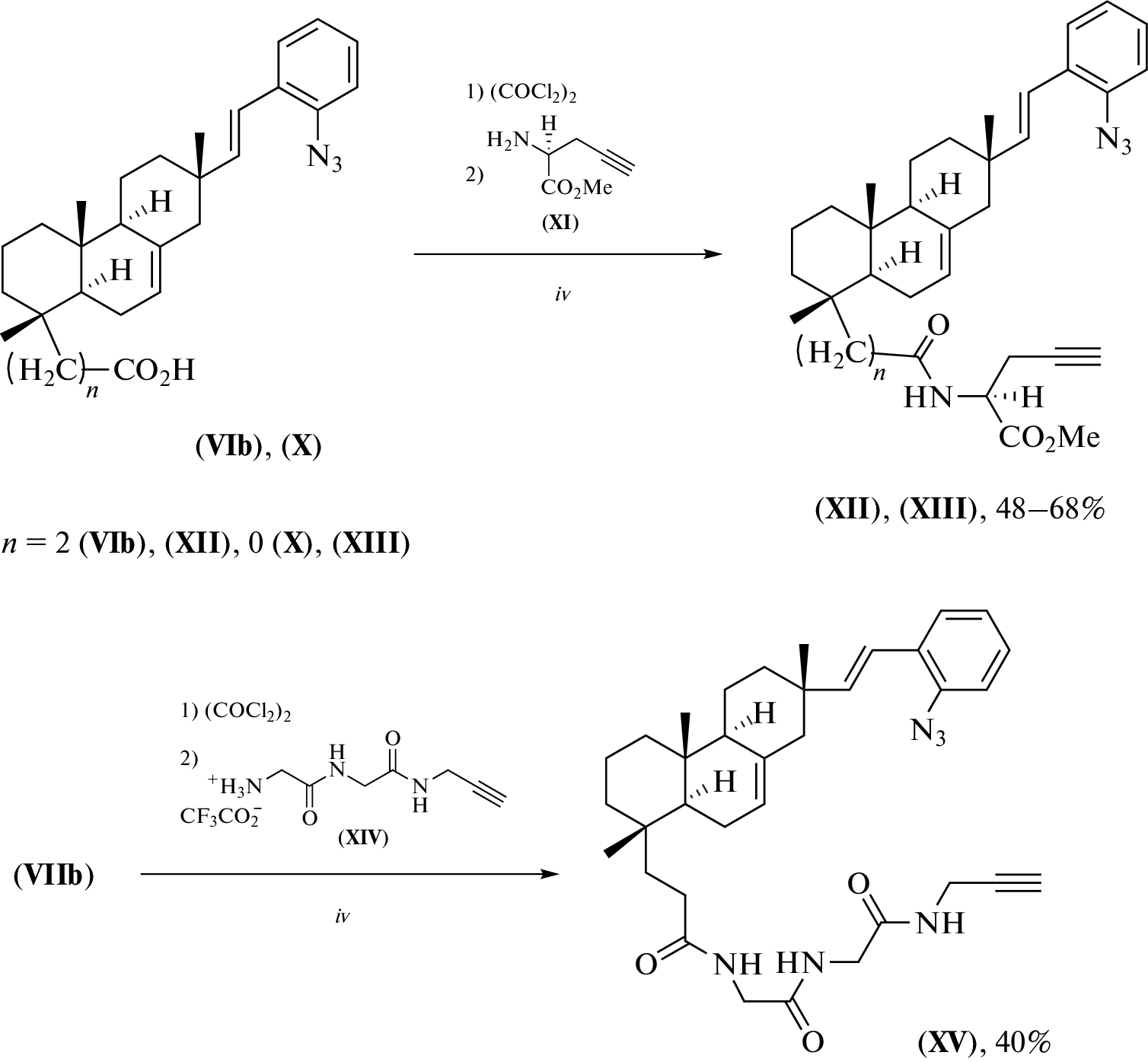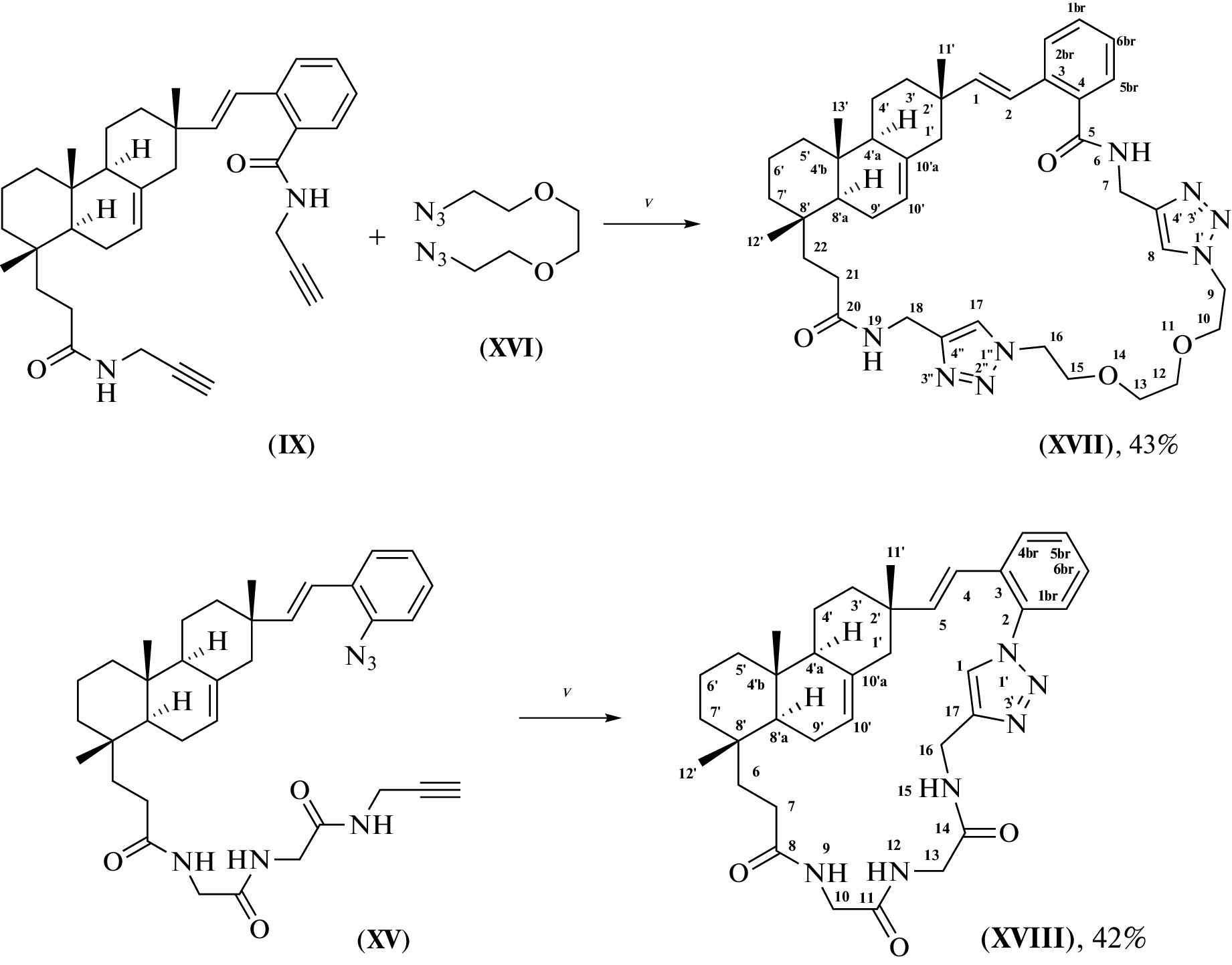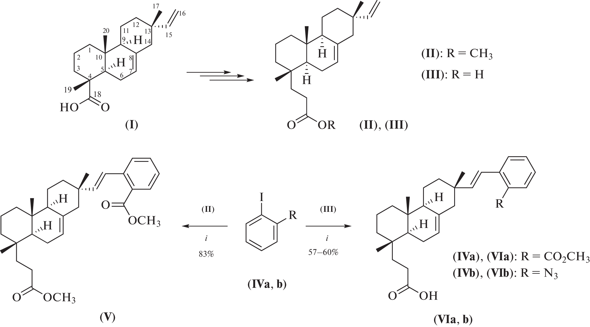 (E)-16-Aryl-substituted derivatives of tricyclic diterpenoids were synthesized by cross-coupling of isopimaric acid derivatives with substituted iodorenes catalyzed by palladium acetate in the presence of silver carbonate. Condensation of (E)-18-nor-4-(carboxyethyl)-16-(2-carboxyethyl)isopimar-7,15-diene dichloride with propargylamine hydrochloride leads to the corresponding dialkine, which readily reacts with diazide in the Cu(I) catalyzed cycloaddition (CuAAC) reaction, with the formation of macroheterocyclic compound containing a pimaran type tricyclic diterpenoid core and 1,2,3-triazole rings in the linker chain. Reaction of in situ prepared (E)-18-nor-16-azido-4-(carboxyethyl)isopimar-7,15-diene acid chloride with propargylamine hydrochloride or an alkynyl-substituted derivative of the protected Gly-Gly dipeptide leads to the corresponding azidoalkynes. The intramolecular CuAAC reaction of azidodipeptidylalkine afforded a macroheterocyclic derivative containing a dipeptide and triazole moiety in the linker chain. The obtained compounds showed higher (compared with the isopimaric acid) cytotoxicity on tumor cells MCF-7 and were less toxic to non-cancer cells than the reference drug doxorubicin. The GI50 value of the most active compound is 6.3 μM, selectivity index >15) (MTT test). The synthesized derivatives of the tricyclic diterpenoid isopimaric acid can be used to develop new antitumor agents.