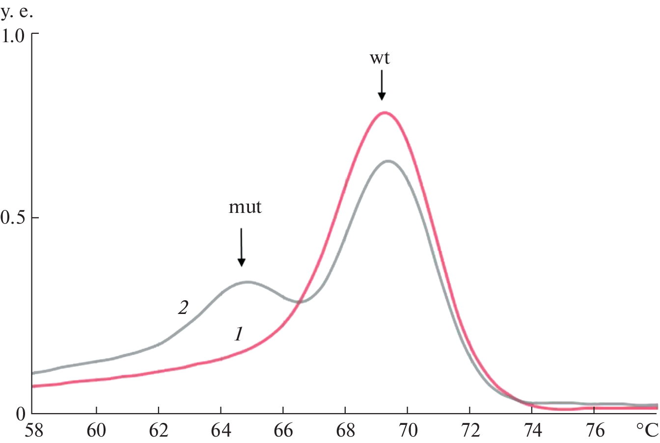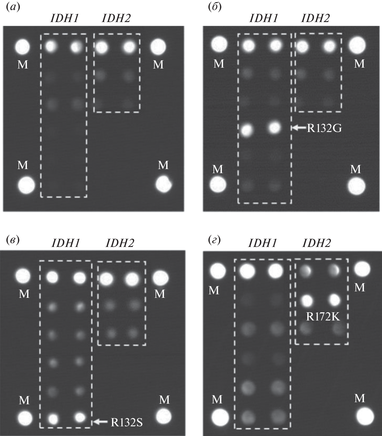 Mutations in isocitrate dehydrogenases 1 and 2 (IDH1 and IDH2) genes are important diagnostic and prognostic markers in a number of tumors (chondroid tumors, brain tumors, leukemia). To determine mutations in the IDH1/2 genes the method of allele-specific hybridization on a biological microarray was developed, which makes it possible to determine the presence of a mutation in a tumor sample (chondroid tumors and glioblastoma) and the variant of nucleotide substitution. When comparing IDH1/2 mutation detection methods using a biological microarray and DNA melting analysis with a TaqMan probe, full coincidence of results was obtained, with the biochip method making it possible to determine the type of nucleotide substitution without an additional sequencing step.