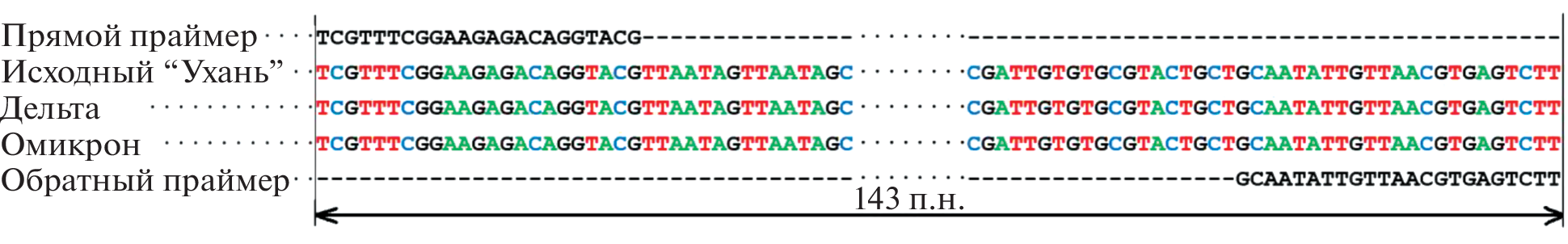 The appearance of mutations in the genes encoding the surface proteins of the new type of coronavirus SARS-CoV-2, when it circulates in the host population, makes it difficult to use monoclonal antibodies for its species identification. In such cases, the choice of conservative genetic targets allows identification by molecular biological methods. In this work, previously developed primers specific to the E gene fragment were tested to detect a new type of coronavirus on six isolates belonging to different genetic variants (the original Wuhan strain, delta and omicron). The choice of a conservative site of the E gene encoding the small transmembrane protein E as a target for reverse transcription with subsequent amplification (RT-PCR) made it possible to detect coronavirus regardless of its subtypes characterized by antigenic heterogeneity in N- and S‑proteins. The possibility of species-level identification of COVID-19 pathogen circulating in Russia is shown, both in the total reaction volume (in a single test tube) and on biological microarrays.