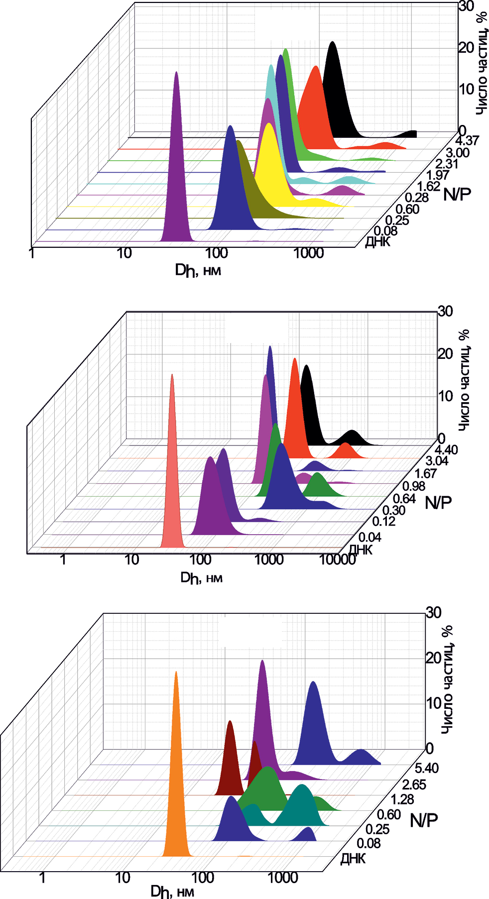 Оценка заряда смешанных композиций показывает, что с увеличением мольного соотношения ПАВ/ДНК происходит компенсационное изменение ζ-потенциала от –84 мВ (ζ-потенциал индивидуальной макромолекулы ДНК) до +38 мВ (рис. 3). Важный параметр – соотношение, соответствующее нулевому значению ζ-потенциала. Величина (N/P)0 уменьшается в ряду ЦТАБ > 16-6-16OH > 16-6-16 (7.50 > 0.74 > 0.27). Этот результат свидетельствует о том, что электростатические взаимодействия вносят значительный вклад при комплексообразовании ПАВ/ДНК.