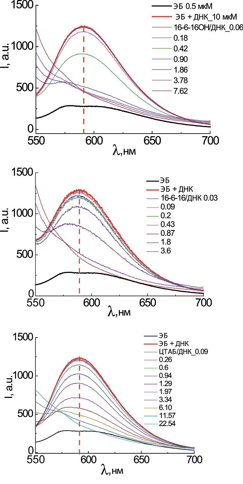Рис. 4. Спектры флуоресценции комплексов этидий бромид/ДНК в присутствии 16-6-16ОН (а), 16-6-16 (б) и ЦТАБ (в). СДНК = 10 мкМ; СЭБ = 0.5 мкМ; 25°С.
