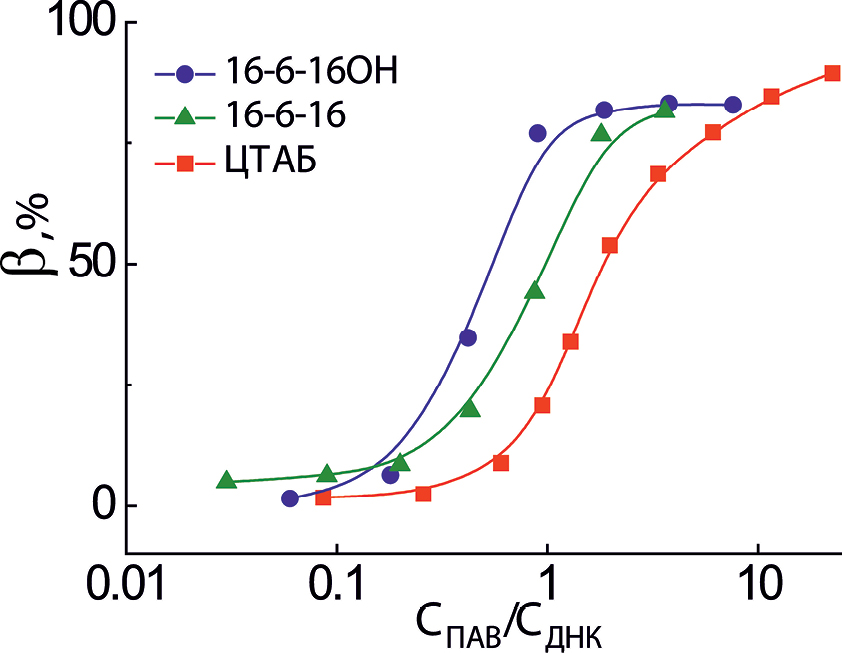 На основании полученных спектров была рассчитана степень связывания ПАВ/ДНК (рис. 5). Для всех изученных амфифилов достигалась высокая степень связывания (90%), однако при различном соотношении компонентов системы. В случае геминальных ПАВ эффективное комплексообразование с ДНК наблюдалось при более низких соотношениях ПАВ/ДНК. Высокая степень связывания между компонентами достигалась при концентрациях геминальных ПАВ меньше концентрации ДНК (ПАВ/ДНК <1), а в случае ЦТАБ – при 10-кратном превышении концентрации амфифила (соотношение ПАВ/ДНК ≥1).