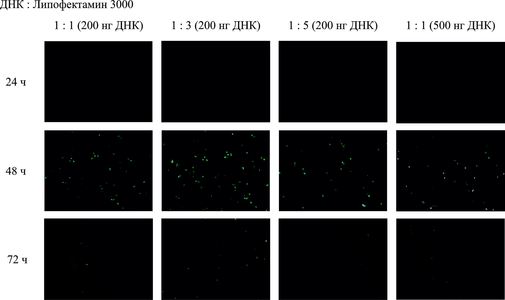 Методом флуоресцентной микроскопии было показано, что максимальный уровень интенсивности флуоресценции репортерного белка в клетках А549 наблюдался на 48 ч инкубации после проведенной трансфекции (рис. 6). При этом наиболее эффективным вариантом для доставки трансгена было соотношение ДНК/Липофектамин 3000 и ДНК 1 : 3 при количестве ДНК 200 нг/лунку (рис. 6).