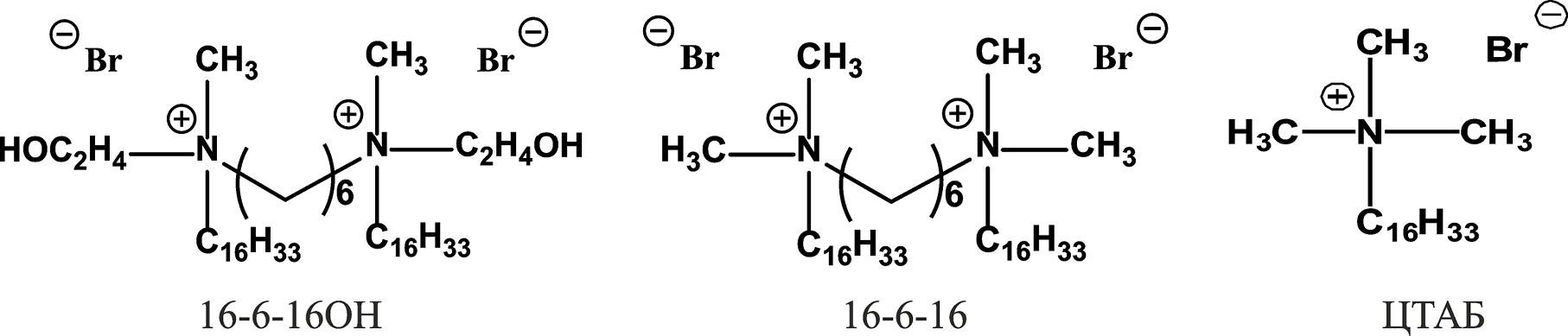 Геминальные ПАВ. Геминальные ПАВ типа m-s-m (где m – длина углеводородного радикала, s – длина спейсера между головными группами) 16-6-16 и его аналог с гидроксиэтильным фрагментом 16-6-16ОН были синтезированы в Институте органической и физической химии им. А.Е. Арбузова в лаборатории высокоорганизованных сред по ранее описанной методике [38, 39]. Строение полученных соединений было подтверждено данными ИК- и ЯМР-спектроскопии [39]. Монокатионный цетилтриметиламмоний бромид (ЦТАБ; Sigma-Aldrich, США) использовали в качестве соединения сравнения без предварительной очистки. Строение полученных соединений было подтверждено данными ИК- и ЯМР-спектроскопии.