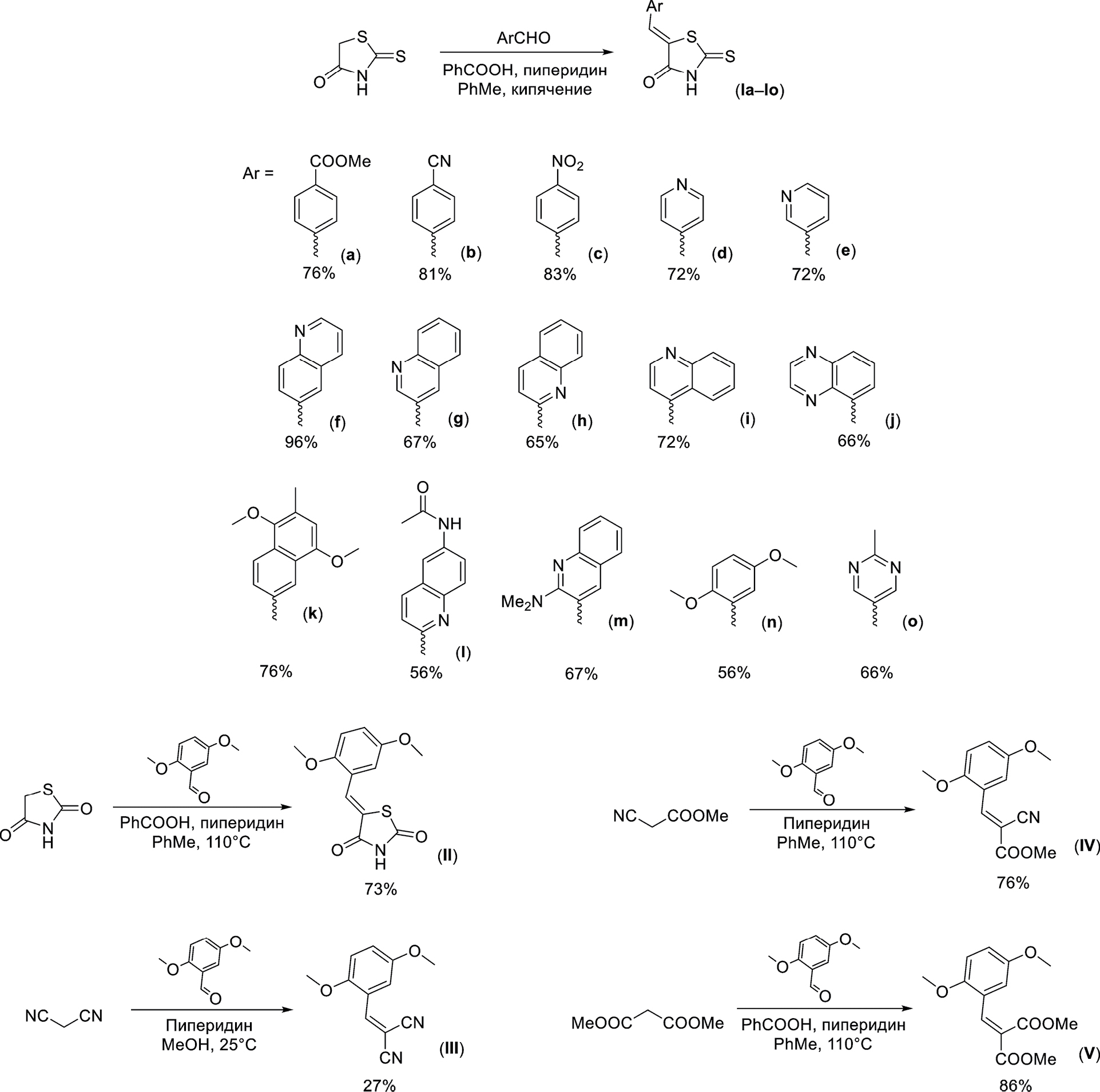 Схема 1. Синтез арилиденроданинов (Ia–Io) и их ациклических аналогов (II–V).