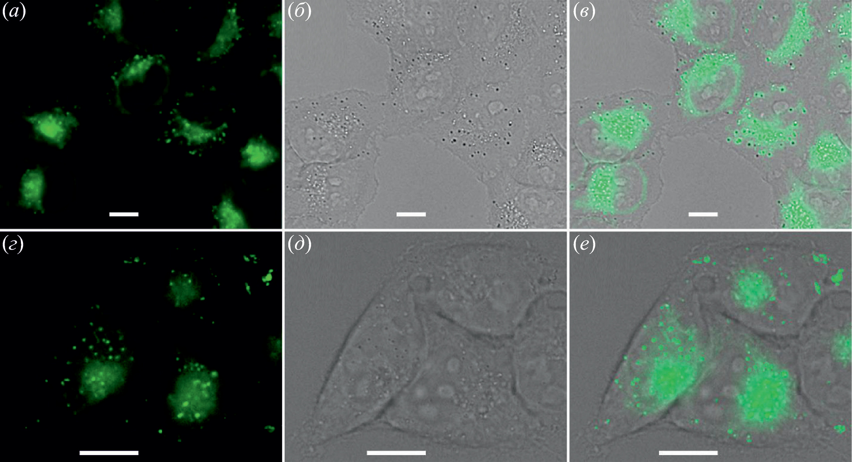 Рис. 1. Микроскопия живых клеток HeLa Kyoto при добавлении 7 мкМ соединения (In) (a–в) или 5 мкМ соединения (III) (г–е). (a, г) – Флуоресценция образцов соединений (In) и (III) соответственно при их проникновении в липидные капли в клетках HeLa Kyoto; (б, д) – клетки HeLa Kyoto в проходящем свете; (в, е) – флуоресцентные сигналы образцов соединений (In) и (III) соответственно, наложенные на изображение клеток в проходящем свете. Масштабная линейка во всех случаях соответствует длине 5 мкм.