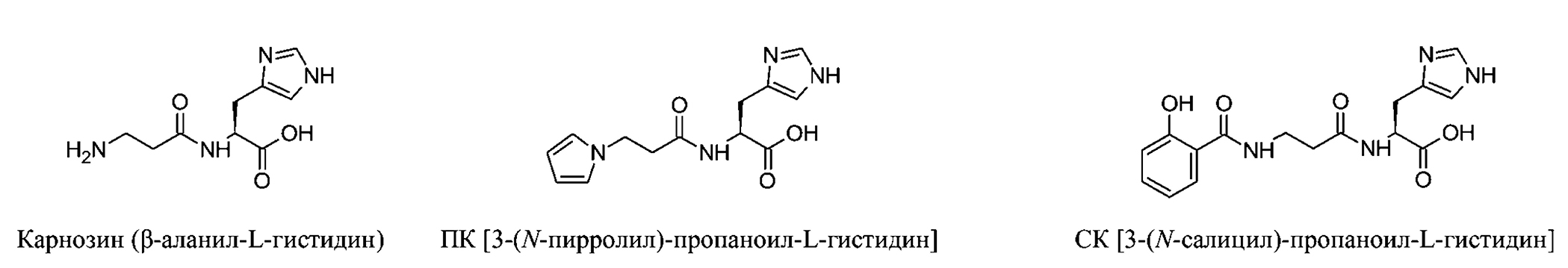 Схема 1. Структурные формулы карнозина (β-аланил-L-гистидина), пирролилкарнозина ([3-(N-пирролил)-пропаноил-L-гистидина]) и салицилкарнозина ([3-(N-салицил)-пропаноил-L-гистидина]).