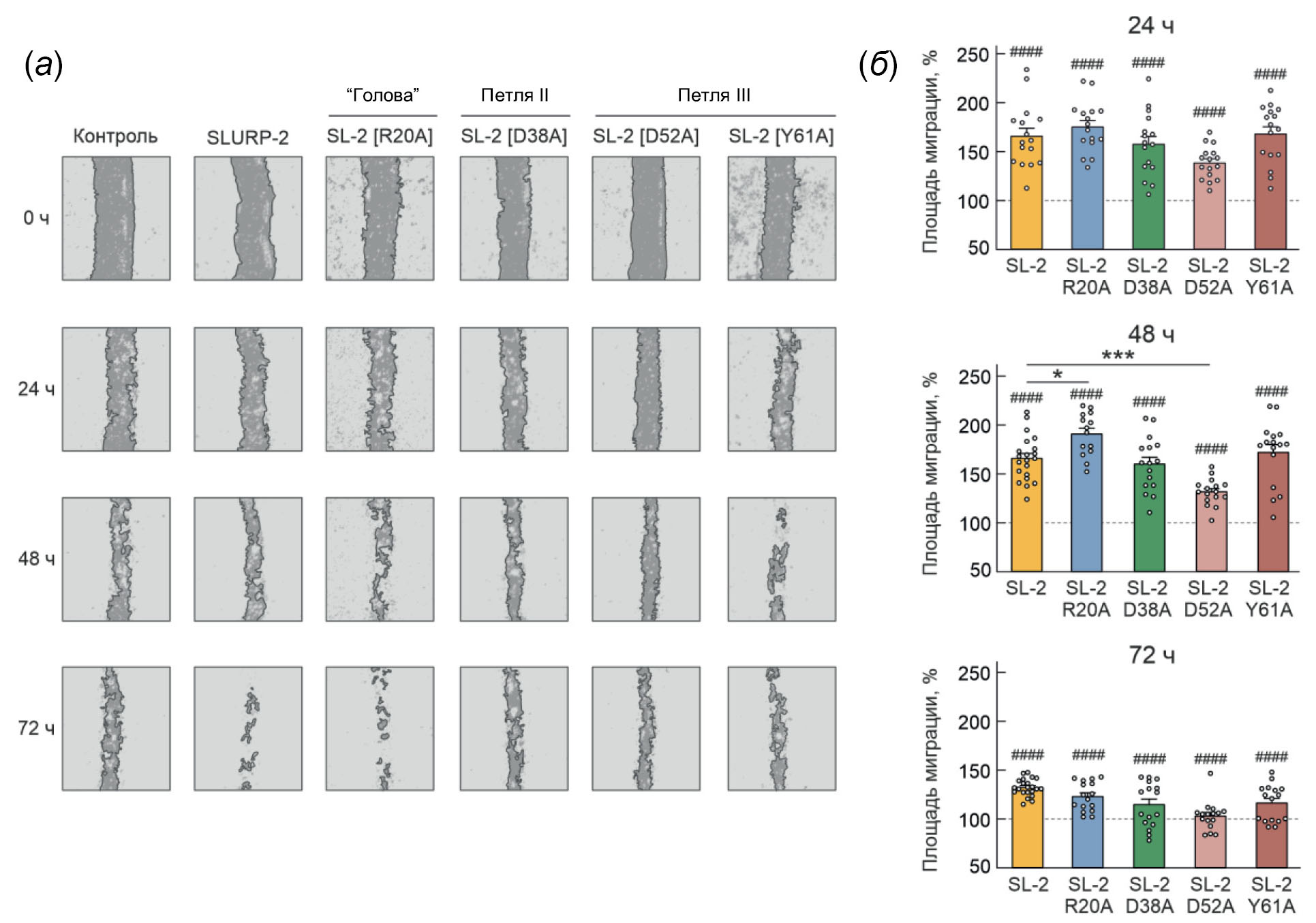Рис. 4. Влияние SLURP-2 и его мутантов на миграцию клеток Het-1A: (а) – репрезентативные изображения теста “заживление раны” для клеток Het-1A, инкубированных c 1 мкМ SLURP-2 (SL-2) или его мутантов в течение 0, 24, 48 и 72 ч; (б) – площадь, занимаемая мигрирующими клетками Het-1A после 24-, 48- и 72-часовой инкубации. Данные представлены в процентах от контроля ± стандартная ошибка среднего (n = 16), 100% соответствует площади миграции необработанных клеток. #### p < 0.0001 указывает на достоверное отличие от контроля (100%) по одностороннему критерию Стьюдента c последующим Holm-Sidak/hoc-тестом; * p < 0.05 и *** p < 0.001 означают достоверное отличие от группы “SLURP-2” по одностороннему тесту ANOVA с последующим Dunnet’s/hoc-тестом.