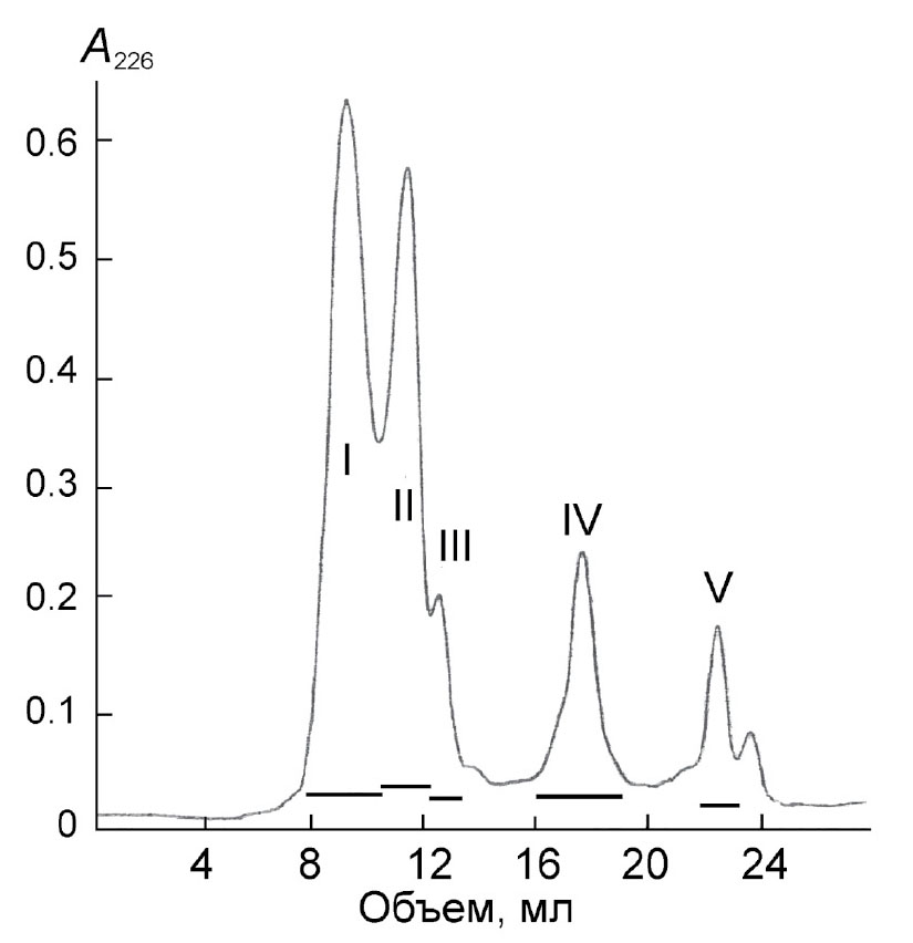 Рис. 1. Разделение яда G. saxatilis гель-фильтрацией на колонке Superdex 75 (10 × 300 мм), уравновешенной 0.1 М ацетатом аммония (рН 6.2), при скорости потока 1 мл/мин. Горизонтальные линии показывают собранные фракции.