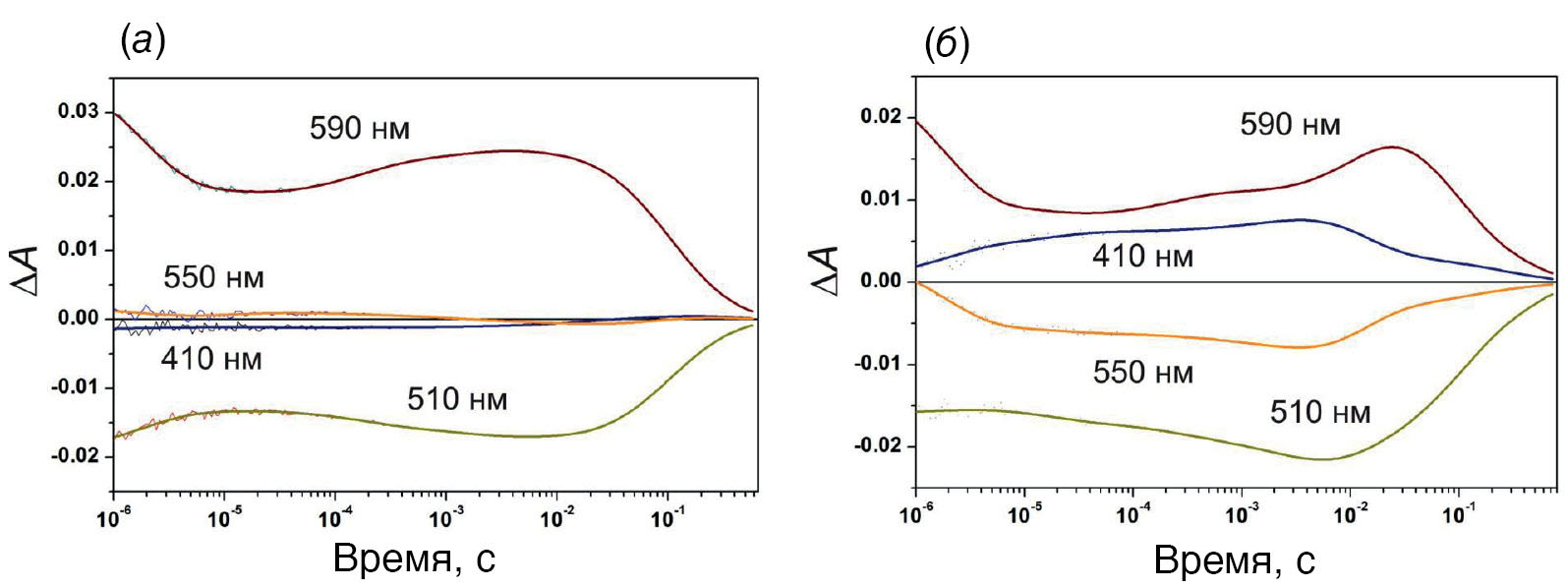 Кинетику светоиндуцированных изменений поглощения MBP-ESR при четырех длинах волн измеряли при двух значениях рН, при этом, как и в случае дикого типа ESR [50], было обнаружено отсутствие интермедиата М (депротонированного основания Шиффа) при рН 7 (рис. 3а). Интермедиаты с максимумом поглощения 590 нм доминируют на протяжении всего фотоцикла. В течение первых 10 мкс после вспышки первый из них частично распадается с появлением других длинноволновых интермедиатов, распад которых с τ ~ 84 мс завершает фотоцикл (рис. 3а).
