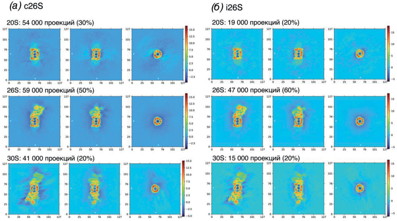 Рис. 2. Результат гетерогенного уточнения (Heterogeneous Refinement) в случае конститутивной с26S (а) и иммунной i26S (б) форм протеасомы. Показаны ортогональные срезы крио-ЭМ-карт вдоль трех осей для трех структурных организаций протеасомных субчастиц. Указаны абсолютные количества соответствующих проекций в выборке данных после двумерной классификации.