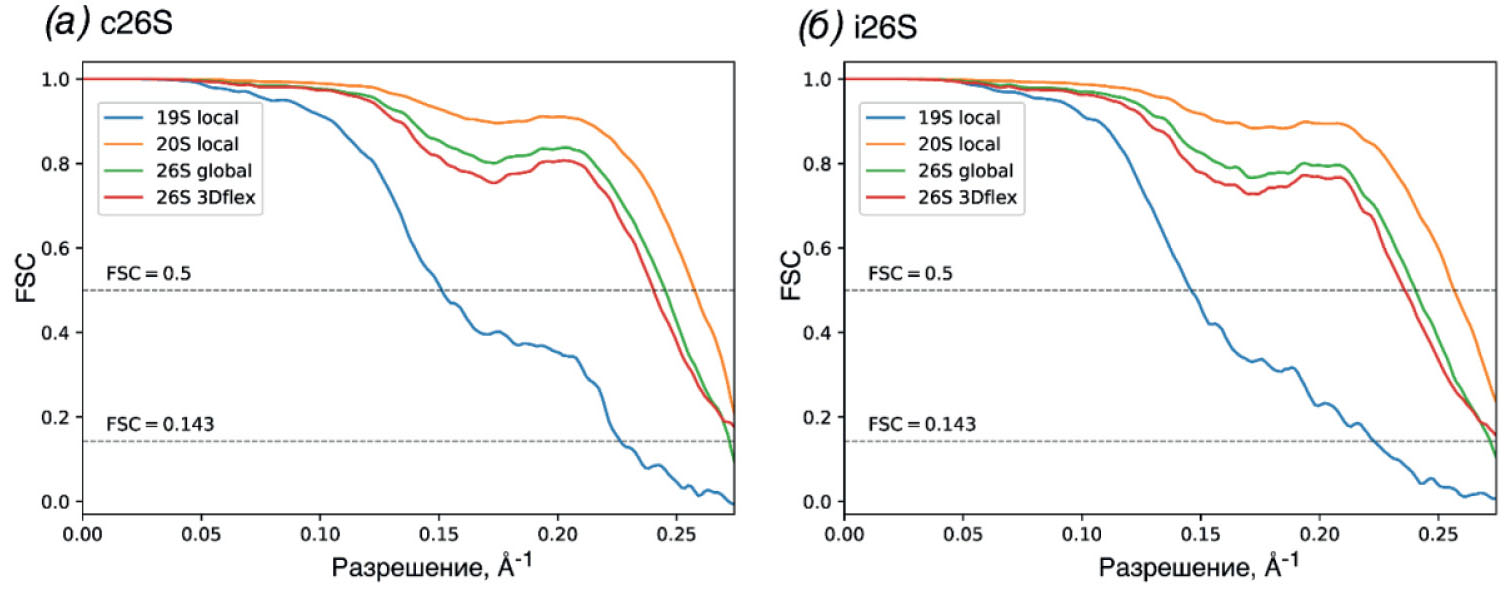 Рис. 3. Корреляционные кривые (Fourier Shell Correlation, FSC) в случае конститутивной c26S (а) и иммунной i26S (б) форм протеасомной субчастицы. Показаны кривые для локального уточнения 19S субчастицы (19S local, синий), локального уточнения коровой 20S субчастицы (20S local, оранжевый), глобального уточнения 26S субчастицы с выравниванием относительно 20S (26S global, зеленый) и уточнения с помощью метода 3D Flexible Refinement (26S 3Dflex, красный). Пунктирными линиями показаны два стандартных пороговых значения корреляций 0.5 и 0.143.