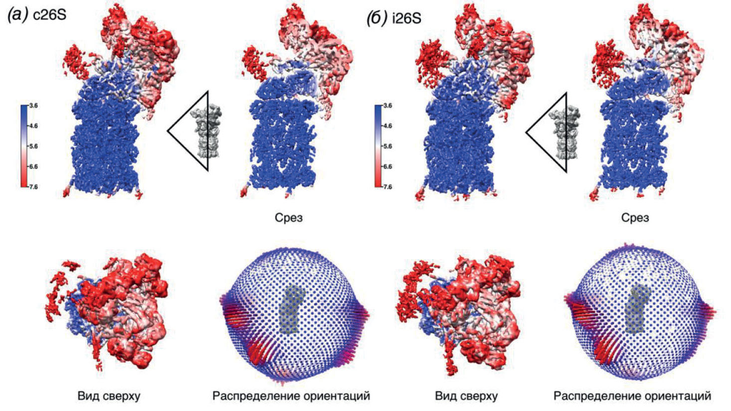 Рис. 4. Результат анализа локального разрешения в случае конститутивной c26S (а) и иммунной i26S (б) форм протеасомной субчастицы, а также распределение проекций 26S в соответствии с найденными угловыми ориентациями. Для визуализации локального разрешения использованы крио-ЭМ-карты, полученные с помощью 3D Flexible Refinement и дополнительно обработанные с помощью DeepEMhancer. Показаны боковой вид, центральный срез и вид сверху.