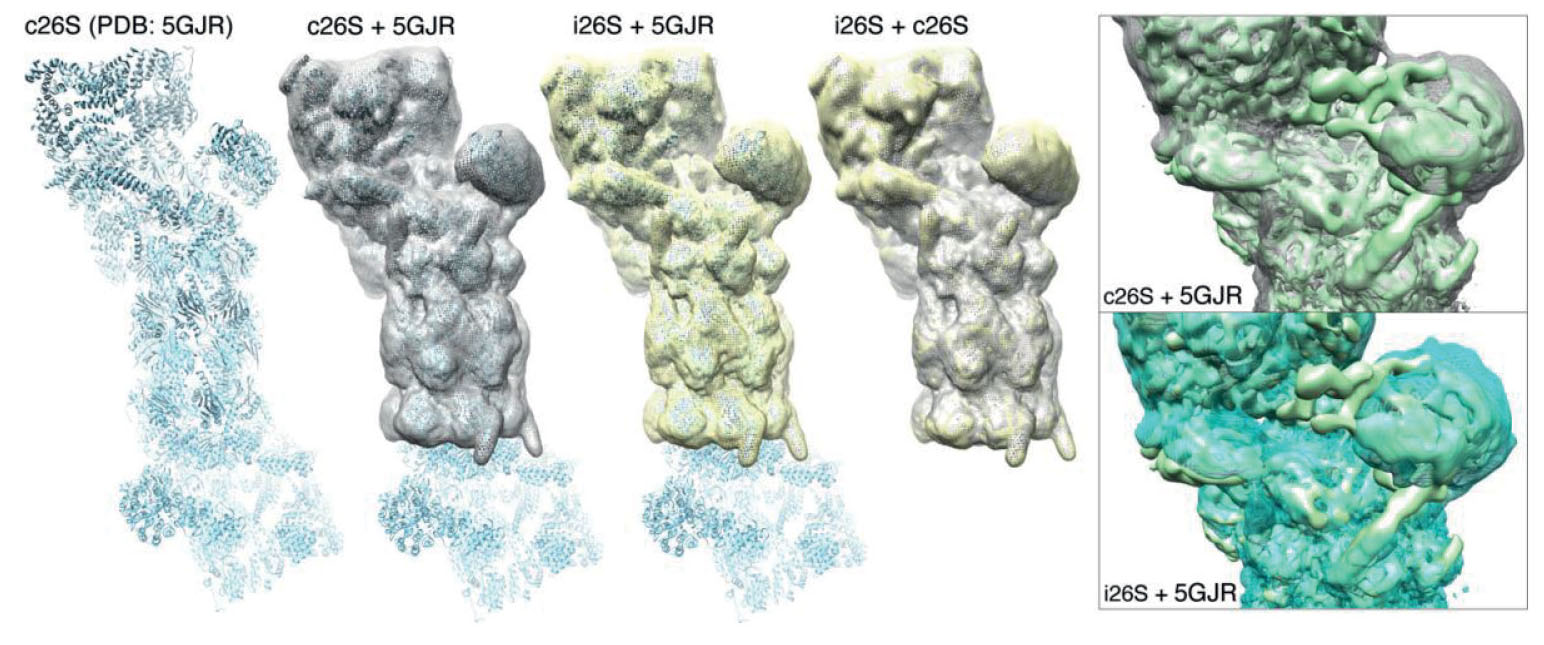 Рис. 5. Сравнительный анализ глобальной структуры 26S протеасомы человека в конститутивной (c26S) и иммунной (i26S) формах. Структура 26S протеасомы человека PDB 5GJR дана в качестве референса.