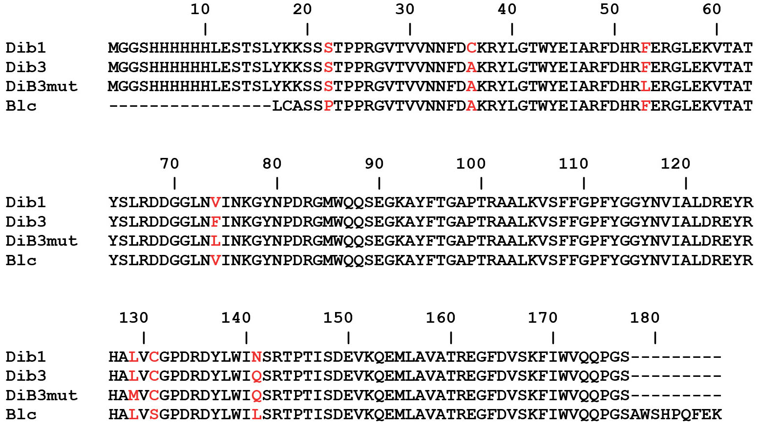 Рис. 1. Сравнение аминокислотных последовательностей родительского бактериального липокалина Blc [2] и его мутантов в комплексах с синтетическим GFP-подобным хромофором M739 [3]. Аминокислотные замены выделены красным цветом. DiB3mut – тройной мутант DiB3-F53L/F74L/L129M.