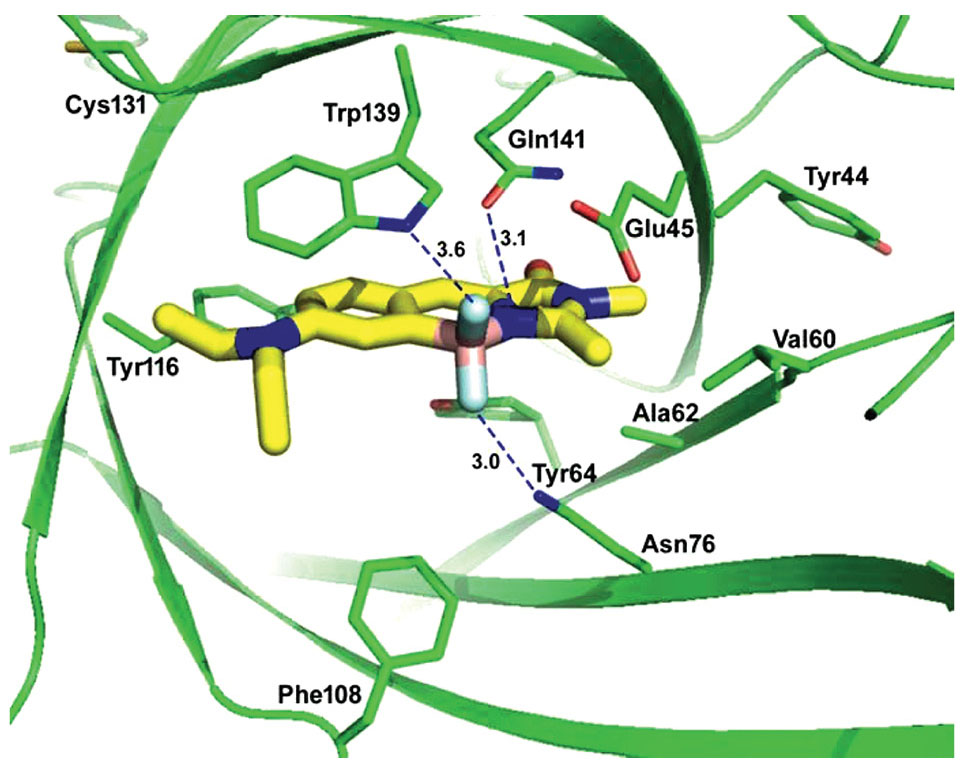 Суперпозиция структур DiB1 и комплекса флуоресцентного белка сандерцианина с биливердином IXα предполагает наличие в липокалинах двух сайтов связывания, способных к π-стэкингу с хромофором. Первый сайт, установленный в комплексах DiB1 и DiB3-F53L/F74L/L129M, содержит ароматический остаток Trp139 в стэкингвзаимодействии с хромофором. В сандерцианине он отсутствует, в этой позиции располагается Ser. Второй минорный сайт, установленный в сандерцианине и в других липокалинах, представляет собой “сэндвич” из двух ароматических боковых цепей Phe53 и Phe108. Аналогично сандерцианину низкоаффинный комплекс DiB3 связывает хромофор в минорном центре за счет π-стэкинга между двумя ароматическими остатками Phe53 и Phe108. При этом, заметное различие фотофизических характеристик DiB3-F53L/F74L/L129M и DiB3 неявным образом подтверждает существование в полости белка обоих центров связывания хромофора.