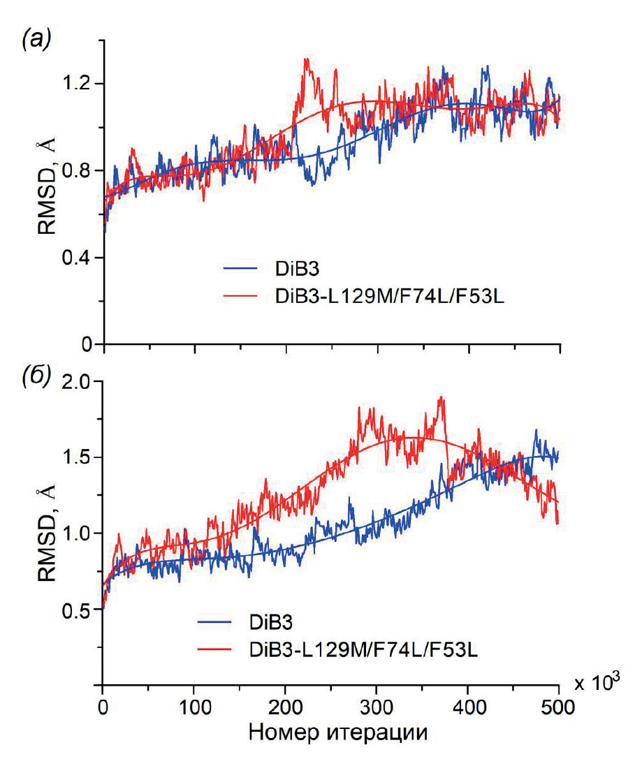 Расчеты методом молекулярной динамики (МД) продемонстрировали конформационную устойчивость обоих комплексов. Соответствующие значения RMSD (0.95 ± 0.15 и 1.35 ± 0.19) вышли на плато, что указывает на стабильность структур родительского белка и его тройного мутанта (рис. 4а). В случае управляемой процедуры MД при протяжке молекулы хромофора вглубь полости белка структура претерпевает локальные конформационные изменения (рис. 4б), которые не приводят к потере нативной структуры (значения RMSD для DiB3 – 1.0 ± 0.27 и его тройного мутанта – 1.5 ± 0.3). Для тройного мутанта DiB3-F53L/F74L/L129M величина энергии хромофор–белок находится на стабильно более отрицательном уровне по сравнению с DiB3, что предполагает более сильные взаимодействия между хромофором и белком на протяжении практически всей траектории движения хромофора (рис. 5).