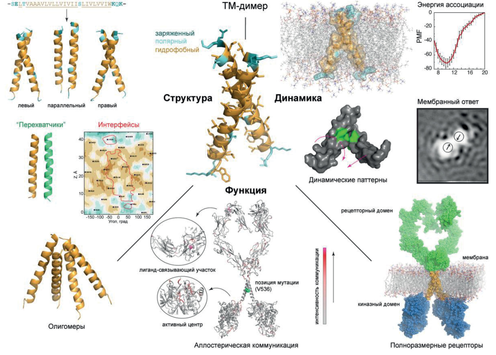 Рис. 1. Структурные, динамические и функциональные аспекты исследования ТМ-доменов БМБ с помощью молекулярно-биофизических методов моделирования. Для иллюстрации использованы ТМД и полноразмерный рецептор PDGFRA.