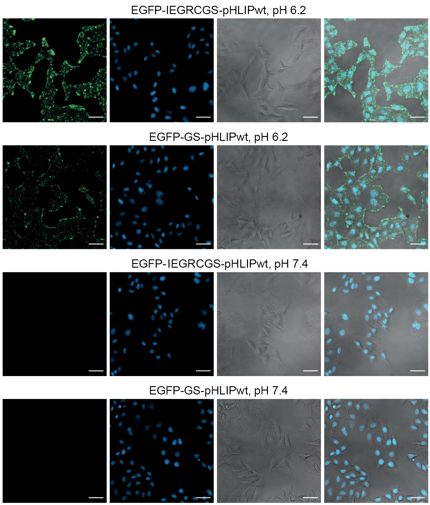 Рис. 4. pH-зависимое связывание EGFP/pHLIPwt с клетками HeLa, определенное с помощью конфокальной микроскопии. Слева направо: изображения в зеленом (EGFP, возбуждение 488 нм, излучение 500–550 нм) и синем (Hoechst 33258, возбуждение 405 нм, излучение 420–470 нм) каналах флуоресценции, проходящем свете и их наложение. Масштабный отрезок 20 мкм.