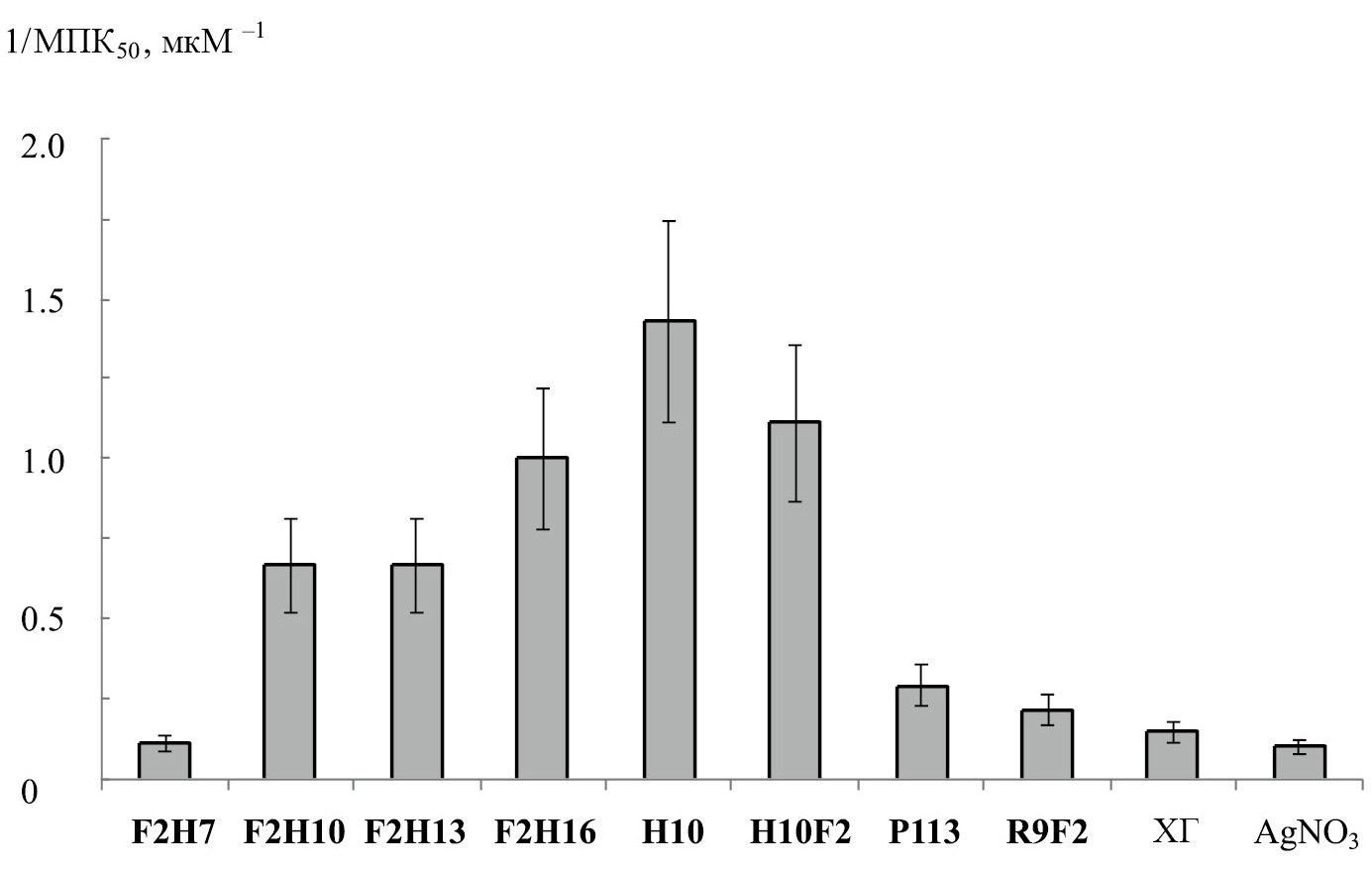 В качестве универсальных положительных контролей для сравнения относительной антигрибковой активности исследуемых пептидов использовали известные антисептические препараты – водные растворы хлоргексидина (ХГ) и нитрата серебра (AgNO3). Во всех исследованных случаях (за исключением пептида F2H7) антигрибковая активность гистидин-содержащих пептидов существенно (в 3 и более раз) превышала активность контрольных препаратов AgNO3 и ХГ (табл. 3, рис. 2).