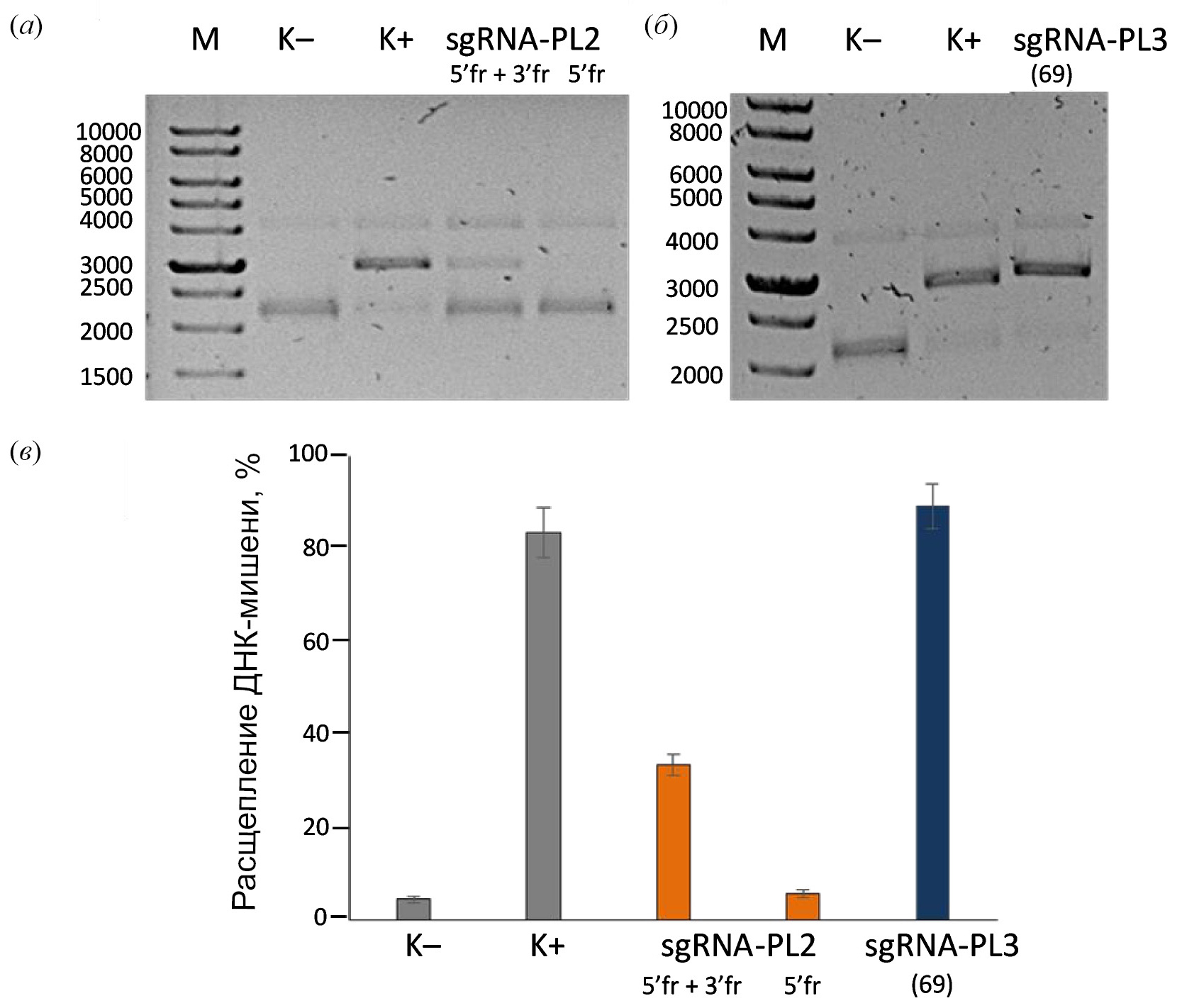 Рис. 3. Электрофоретический анализ продуктов расщепления плазмиды pBluescriptII SK(−) в присутствии фрагментов sgРНК в 1%-ном агарозном геле. М – маркер длины ДНК, К⁻ – исходная кольцевая суперскрученная плазмидная ДНК-мишень, содержащая незначительное количество ДНК в релаксированной форме; K+ – продукт расщепления ДНК-мишени в присутствии немодифицированной химически синтезированной sgРНК; (а) – sgRNA-PL2 – продукты расщепления ДНК-мишени в присутствии 5ʹfr_sgRNA-PL2 и 3ʹfr_sgRNA-PL2 (5ʹfr +3ʹfr) или только 5ʹfr_sgRNA-PL2 (5ʹfr); (б) – sgRNA-PL3 (69) – продукты расщепления ДНК-мишени в присутствии 69-звенного 5ʹ-фрагмента sgRNA-PL3; (в) – анализ эффективности расщепления плазмиды нуклеазой Cas9 в присутствии фрагментов sgРНК. Условия расщепления см. в “Эксперим. части”. Данные получены усреднением результатов не менее двух независимых экспериментов.