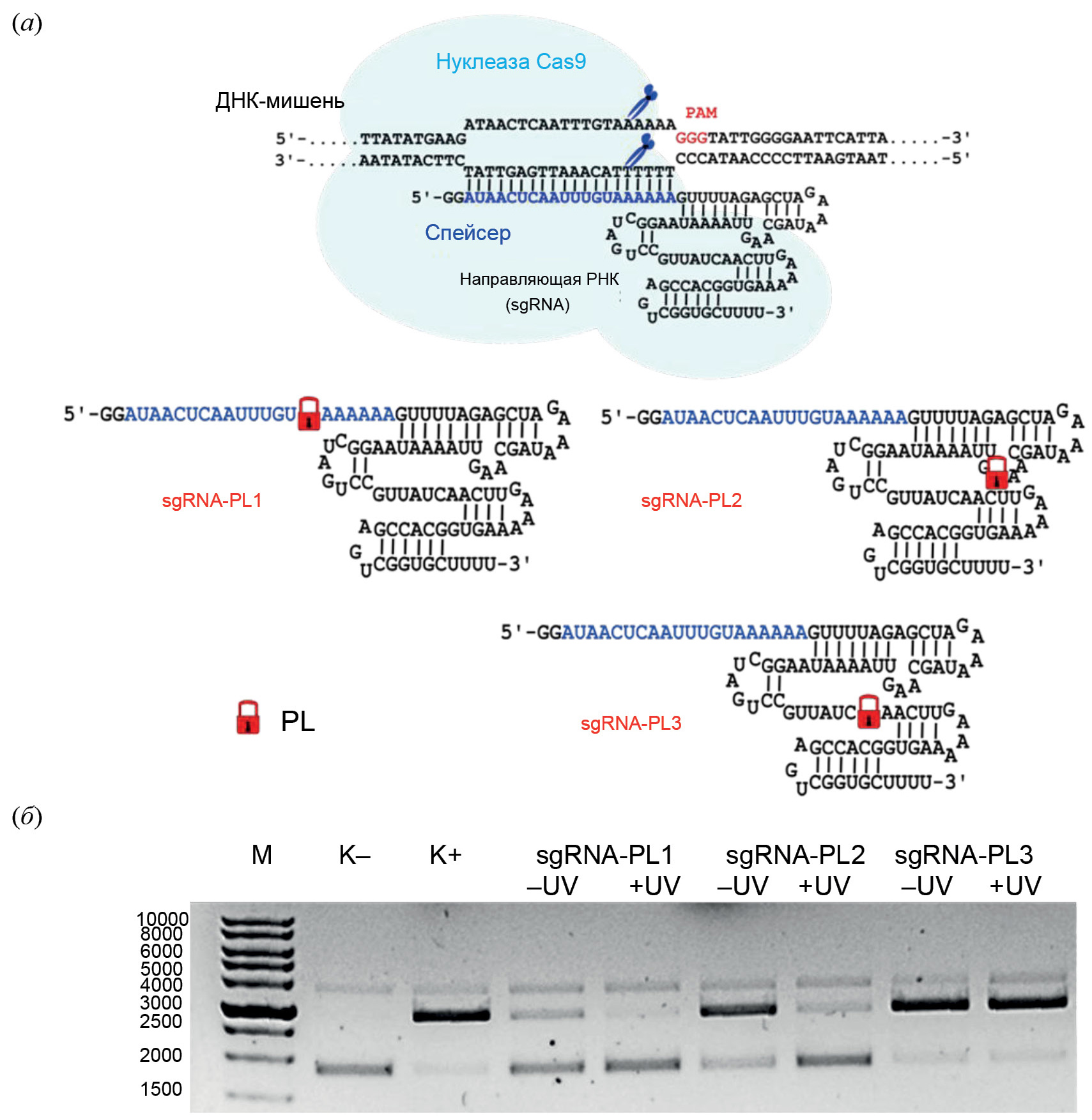 На первом этапе проводили сравнительное изучение способности фотомодифицированных и контрольных немодифицированных направляющих РНК индуцировать расщепление плазмидной ДНК-мишени pBluescriptII SK(−) белком Cas9. Плазмида pBS2SKM содержала протоспейсерную последовательность и PAM (5'-TGG-3'). В ходе эксперимента фотолабильные направляющие РНК sgRNA-PL1, sgRNA-PL2 и sgRNA-PL3 предварительно облучали УФ-светом (365 нм) в течение 30 мин. Длительность облучения подбирали так, чтобы происходило количественное расщепление PL в составе РНК. Затем использовали их в реакции направленного расщепления ДНК нуклеазой Cas9, при этом для сравнения исследовали также расщепление ДНК-мишени в присутствии необлученных фотолабильных направляющих РНК (рис. 1).
