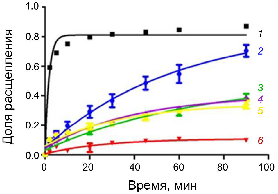 Рис. 5. Кинетические кривые расщепления ДНК-мишени комплексом белка Cas9 с sgRNA-PL2. 1 – контрольная РНК (sgRNA), 2 – фоточувствительная РНК (sgRNA-PL2), 3 – дезактивированная фоточувствительная РНК в комплексе с Cas9, 4 – остановка реакции УФ-облучением (30 мин) с 5-й минуты от начала реакции, 5 – остановка реакции УФ-облучением (5 мин) с 5-й минуты от начала реакции, 6 – дезактивированная вне комплекса с Cas9 фоточувствительная РНК. Условия расщепления см. в “Эксперим. части”. Данные получены усреднением результатов не менее трех независимых экспериментов.