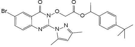 1-(4-(трет-Бутил)фенил)этил 2-((6-бром-2-(3,5-диметил-1H-пиразол-1-ил)-4-оксохиназолин-3(4H)-ил)окси)ацетат (VIIb). Выход 130 мг (58.7%), светло-бежевые кристаллы, т. пл. 119–120°С. Спектр 1H-ЯМР (DMSO-d6): 8.26 (д, J 2.3, 1H), 8.04 (дд, J 8.7, J 2.4, 1H), 7.65 (д, J 8.7, 1H), 7.37 (д, J 8.4, 2H), 7.26 (д, J 8.4, 2H), 6.13 (с, 1H), 5.88 (кв, J 6.6, 1H), 5.11 (д, J 1.7, 2H), 2.40 (д, J 0.8, 3H), 2.01 (с, 3H), 1.48 (д, J 6.6, 3H), 1.28 (с, 9H). Спектр 13C-ЯМР (CDCl3): 165.92, 158.17, 151.89, 151.37, 144.02, 138.39, 137.91, 129.86, 129.82, 126.30, 125.68, 123.92, 121.46, 108.75, 77.66, 77.23, 76.81, 74.04, 73.48, 34.78, 31.54, 22.10, 13.62, 12.26. HRMS: m/z 553.1492 [M]+. Вычислено для (C27H30BrN4O4)+: 553.1449.