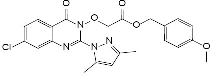 4-Метилбензил 2-((2-(3,5-диметокси-1H-пиразол-1-ил)-7-хлор-4-оксохиназолин-3(4H)-ил)окси)ацетат (VIIc). Выход 125 г (55.2%), белые кристаллы, т. пл. 91–92°С. Спектр 1H-ЯМР (DMSO-d6): 8.17 (д, J 8.6, 1H), 7.79 (д, J 2.0, 1H), 7.64 (дд, J 8.6, J 2.0, 1H), 7.30–7.13 (м, 4H), 6.16 (д, J 1.0, 1H), 5.13 (д, J 2.0, 4H), 2.42 (д, J 0.9, 3H), 2.30 (с, 3H), 2.10 (с, 3H). Спектр 13C-ЯМР (CDCl3): 166.68, 158.74, 151.90, 146.07, 144.12, 143.71, 141.53, 138.62, 132.29, 129.47, 128.75, 128.66, 128.27, 127.52, 120.89, 108.92, 74.05, 67.04, 21.40, 13.68, 12.36. HRMS: m/z 453.1332 [M]+. Вычислено для (C23H22ClN4O4)+: 453.1328.