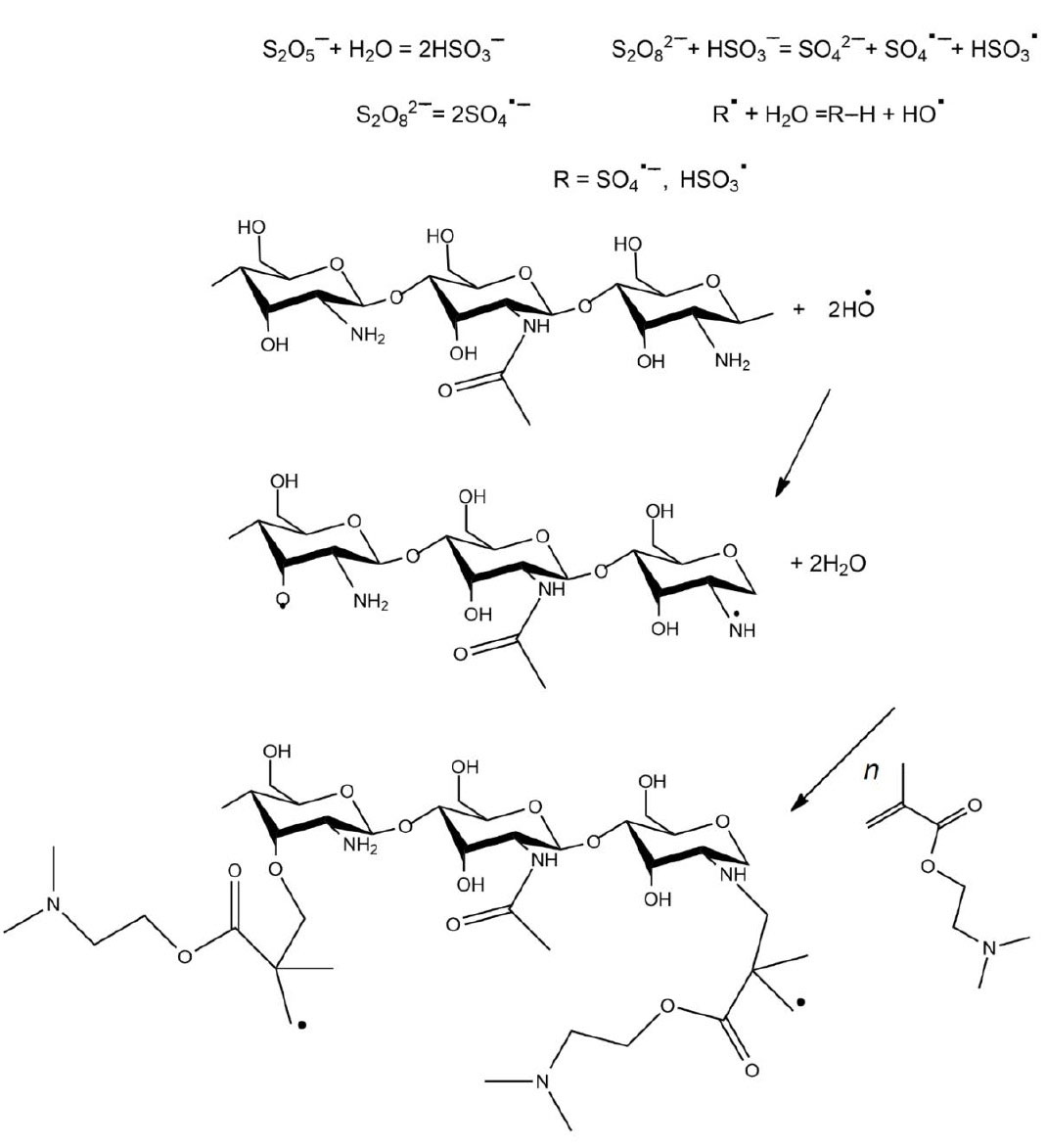 Привитой сополимер хитозана и поли-N,N-диметиламиноэтилметакрилата (ХТЗ-ДМАЭМА) получали растворной радикальной полимеризацией в 2%-ном растворе уксусной кислоты при 40°С в течение 18 ч. В качестве инициатора реакции использовали смесь персульфата калия и метабисульфита натрия в мольном соотношении 1 : 1. Значение рН итоговой реакционной смеси составляло 4.9 ± 0.2. Согласно имеющимся литературным данным, условия протекания сополимеризации винилового мономера и полисахарида, в особенности температура и значения рН реакционной среды, оказывают значительное влияние на архитектуру образующейся структуры. В жестких условий (рН < 2, T > 60°C) формируется преимущественно блок-сополимер полисахарида и выбранного мономера. В случае осуществления процесса в мягких условиях (рН > 5, T > 30–50°C) основной продукт реакции – это привитой сополимер [11–13]. Кроме того, в таких условиях наблюдается меньшее количество побочных реакций, в том числе окисления полисахаридов до токсичных соединений, что повышает выход целевого продукта и чрезвычайно важно для полимеров биомедицинского назначения. Механизм образования целевого продукта – привитого сополимера – представлен на схеме 1.