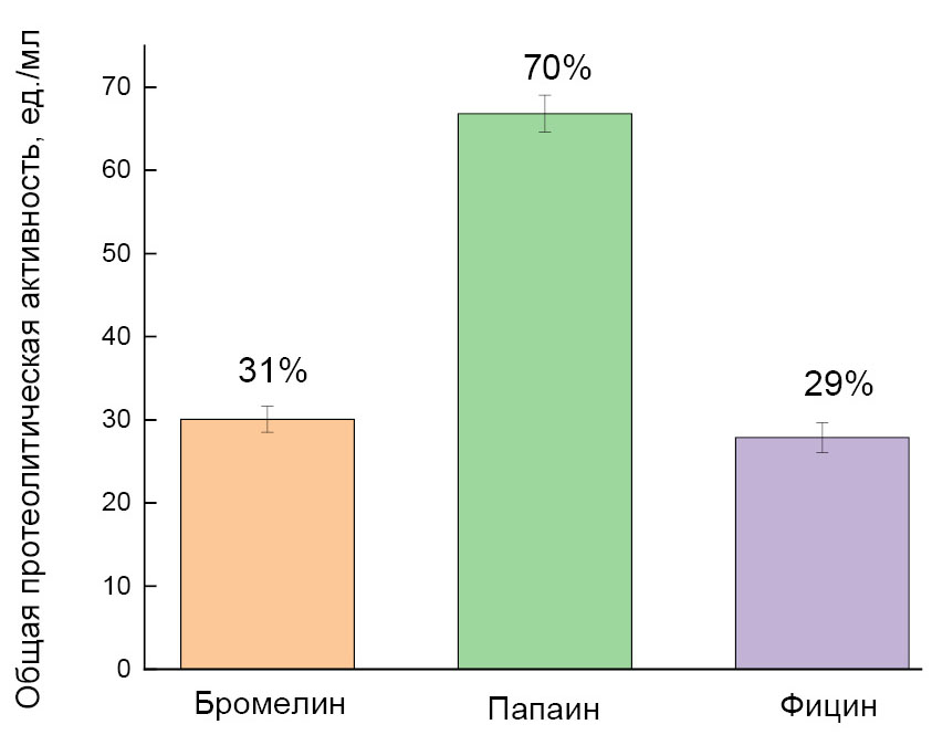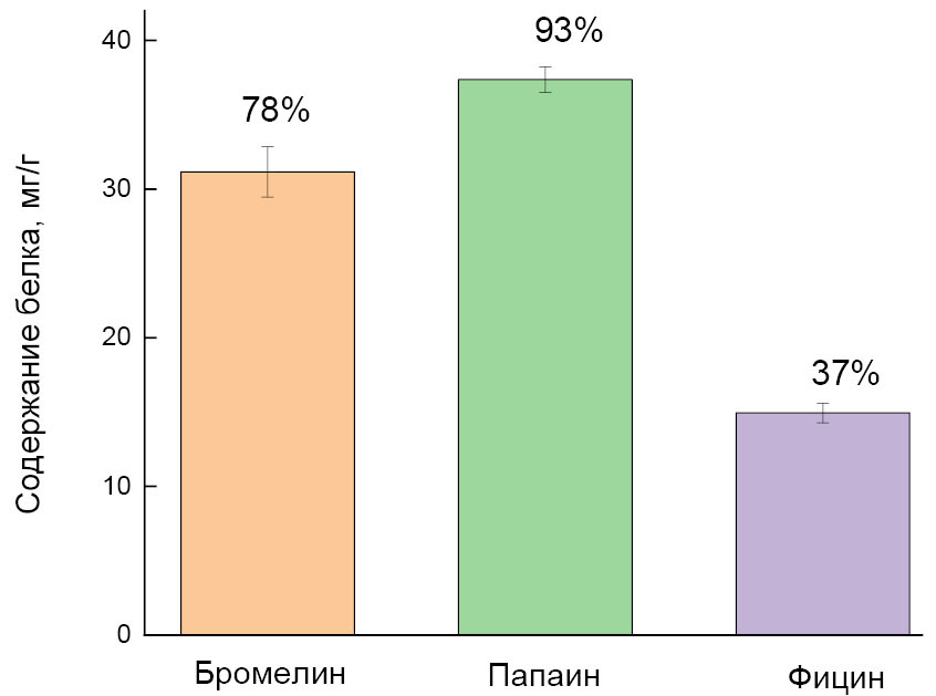 В результате определения содержания белка в полученных комплексах по методу Лоури выявлено, что наибольший выход комплексообразования по белку достигается для папаина (93%, 37.37 ± 1.69 мг/г), а наименьший – для фицина (37%, 14.95 ± 0.66 мг/г) (рис. 1). Эта же тенденция сохраняется для общей протеолитической активности комплексов: их активность ниже по сравнению со свободными ферментами, для папаина она составляет 70% (66.81 ± 2.22 ед./мл), для бромелина – 31% (30.06 ± 1.57 ед./мл), для фицина – 29% (27.87 ± 1.79 ед./мл) (рис. 2).