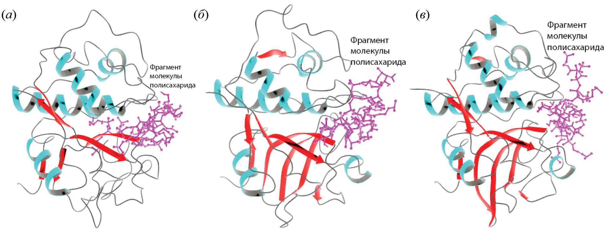 Рис. 3. Топология комплексов бромелина (а), папаина (б) и фицина (в) с привитым сополимером хитозана и поли-N,N-диметиламиноэтилметакрилата, рассчитанная методом гибкого молекулярного докинга. Фрагмент молекулы привитого сополимера хитозана и поли-N,N-диметиламиноэтилметакрилата обозначен розовым цветом. α-Спиральные фрагменты молекулы фермента, входящие в состав преимущественно L-домена, обозначены бирюзовым цветом. Красным цветом выделены β-складчатые области, преобладающие в составе R-домена. На стыке L- и R-доменов образуется углубление (каталитический карман), содержащее активный центр фермента.